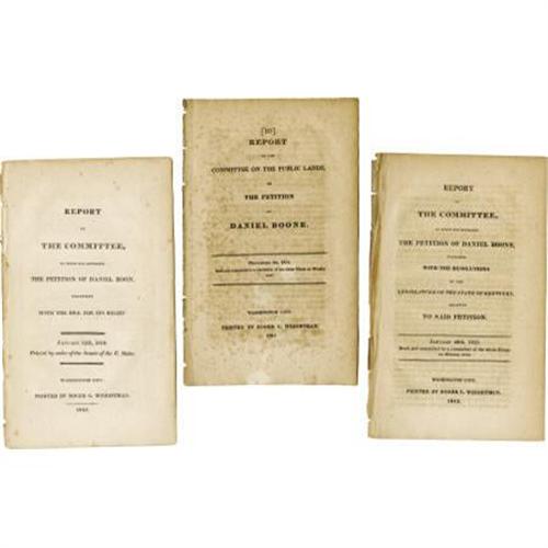 <B> Daniel Boone Three Congressional Reports 1810-1813</B></I> all printed by Roger C. Weightman, Washington City, regarding Daniel Boone's Petition, first to the House and ultimately the Senate, requesting a grant of 1,000 arpens of land which he claims were promised to him for services rendered to the government of the United States. Despite his daring acts of courage and his status as America's first folk hero, his petition was at first denied. Boone served as syndic and commandant until 1804, when Missouri became part of the United States following the Louisiana Purchase. Because Boone's land grants from the Spanish government had been largely based on verbal agreements, he once again lost his land claims. In 1809, he petitioned Congress to restore his Spanish land claims, which was finally done in 1814. Boone sold most of this land to repay old Kentucky debts. A fascinating record. All fine or better. <BR><BR><b>Shipping:</b> Flat Material, Small (<a target="_blank" href="http://www.heritageauctions.com/common/shipping.php">view shipping information</a>)