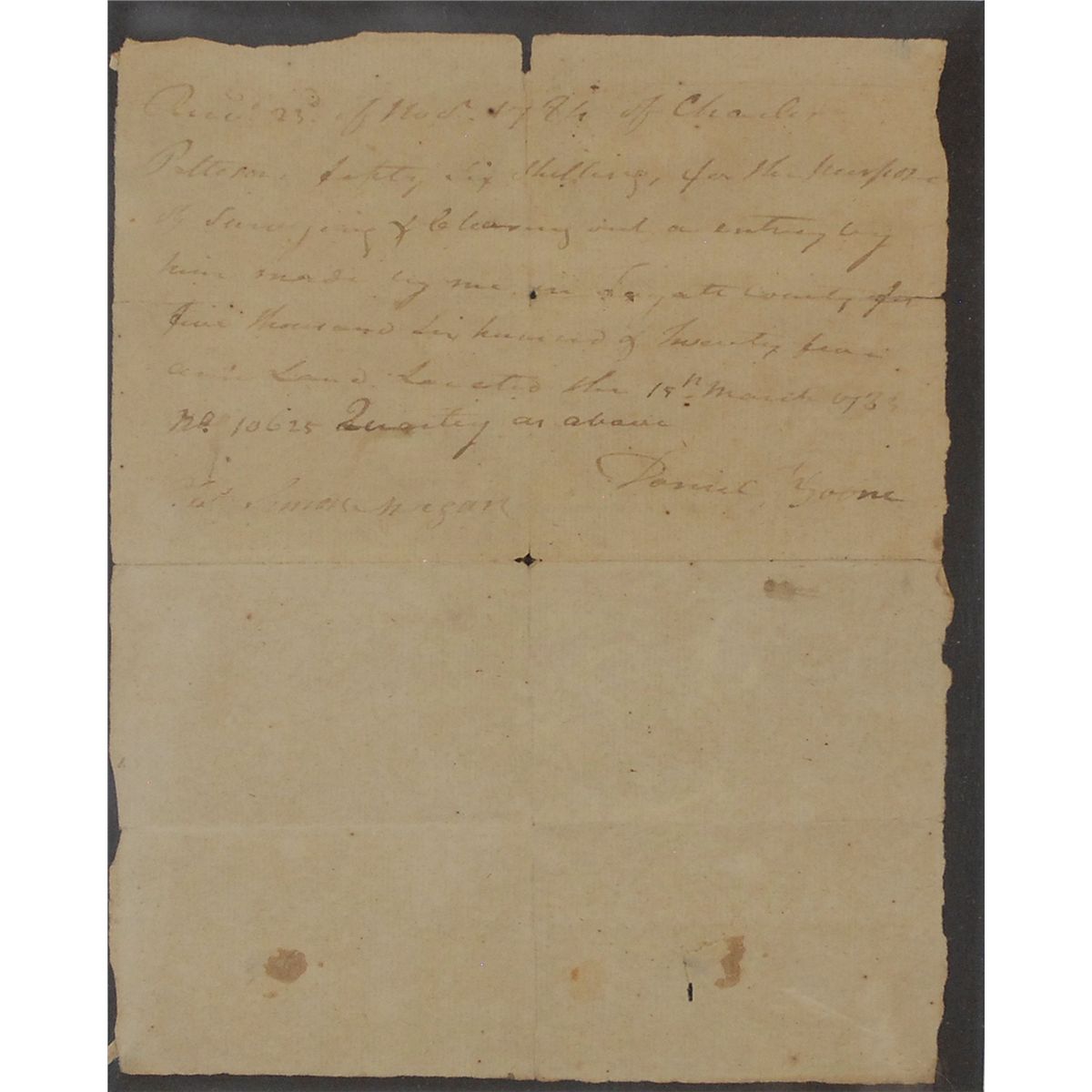 Autograph DS, one page, 6.5 x 8, November 23, 1784. Boone confirms receipt of a payment for surveying work in Fayette County, Kentucky. In part: “Rec’d…of Charles Patterson sixty six shillings, for the purpose of surveying & clearing out a entry by him made by me in Fayatt [sic] county for five thousand six hundred & twenty five acre land.” Attractively double-suede-matted and framed with a portrait and engraved biographical plaque to an overall size of 31 x 18. In very good condition, with intersecting folds with tiny holes at intersections (not affecting the signature), a few small edge tears, and a couple stray marks of ink.