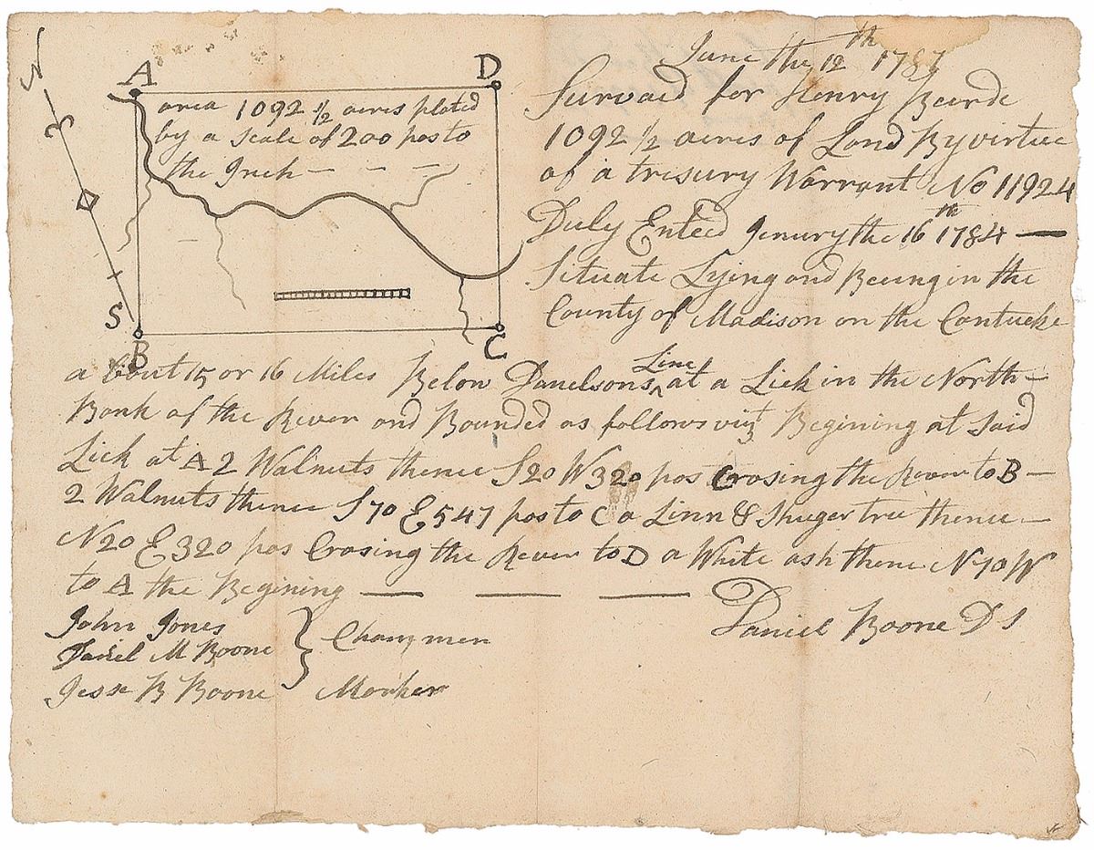 Extremely rare ADS, signed “Daniel Boone DS,” one page, 8 x 6.25, June 12, 1787. Land survey for Henry Burds of Madison County, Kentucky, in full (grammar and spelling retained): "Survaid for Henry Burds 1092 1/2 acres of Land By virtue of a tresury Warrant No 11924 Duly Enterd Janury the 16th 1784—Situate Lying and Being in the County of Madison on the Cantucke about 15 or 16 Miles Below Danelsons Line at a Lick in the North Bank of the River and Bounded as following Begining at said Lick at A2 walnuts thence S20 W320 pos Crosing the River to B2 Walnuts thence S70 E547 pos to ca Linn & Shuger tree thence N20 E320 pos Crosing the River to D a White ash thence N70 W to A the Begining." Boone has added a plat drawing of the Burds acreage in the upper left, and has also docketed the reverse, "Henry Burds platt of 1092 1/2 acres." Signed at the conclusion by Boone as deputy surveyor, and signed in the lower left by the survey's chainmen and marker: John Jones, Daniel M. Boone, and Jesse B. Boone. In fine condition, with a small area of dampstaining at the top edge.