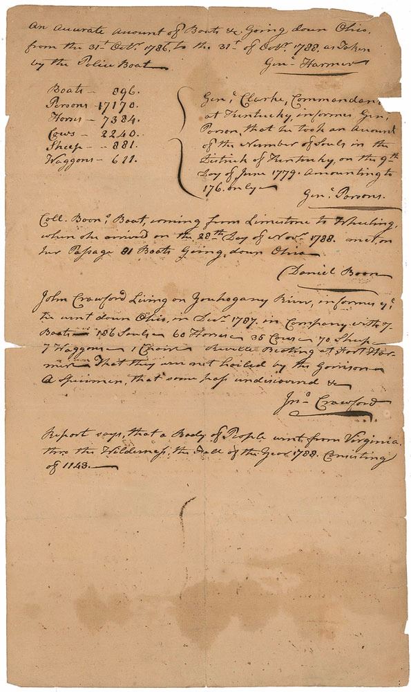 Manuscript document, one page, 7.5 x 12.5, dated October 31, 1788. An important document quantifying the tremendous surge of settlement into the trans-Appalachian west during the late 1780s, which compiles intelligence from a variety of eyewitnesses including Daniel Boone, General George Rogers Clark, General Samuel H. Parsons, General Josiah Harmar and Kentucky settler John Crawford. The account illustrates the dramatic surge in western settlement following the Revolution. Parsons reiterates an account of George Rogers Clark, then Commander at Kentucky who notes that in 1779, the entire population “in the District of Kentucky… Amounting to 176 only.” However, according to an account by General Harmar “as taken by the Police Boat” between October 31, 1786 and October 31, 1788 there were 896 boats conveying a total of 17,170 persons together with 7,384 horses, 2,240 cows, 881 sheep, and 611 wagons. Also attesting to vastly increased volume of river traffic, Daniel Boone counted 81 boats going down the Ohio river during his passage from Limestone to Wheeling in November, 1788. Not all settlers traveled by river however. At the bottom of the document is an anonymous report noting "a Body of People went from Virginia thro the Wilderness the fall of the Year 1788 Consisting of 1143." These were likely settlers bound for Kentucky. In very good condition, with professional repairs to separations on reverse, scattered toning and staining, a few trivial edge chips and previous storage folds. All writing remains bold and legible. The large volume of migrants continued unabated and by 1792 there were enough settlers in the region that Kentucky could form as a state. An important and early account of the trans-Appalachian migration.