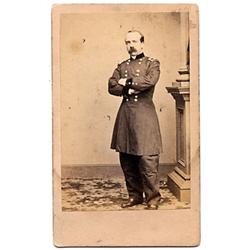 Severely wounded at Gettysburg. Composer of "Taps," active in business and diplomacy. This full standing studio portrait by Anthony/Brady has a period pen identification (probably not in his hand) identifying him as" Maj. Gen. Vols. Col. 5th Infy." [3]