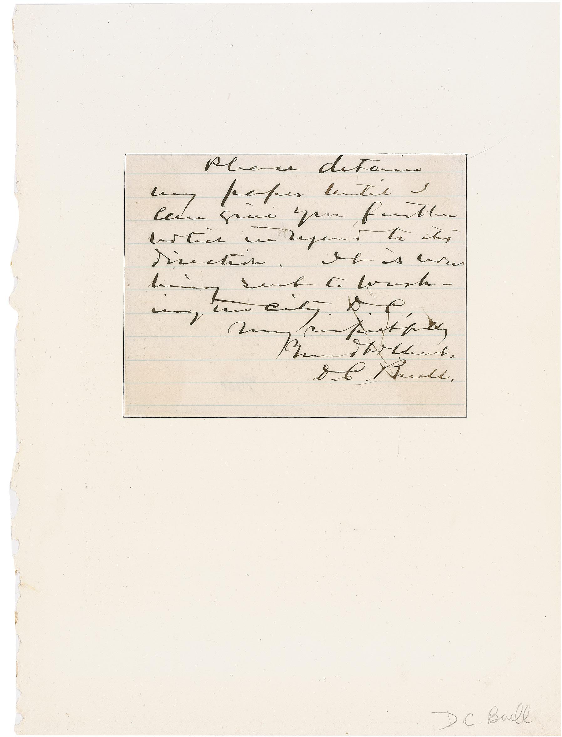 American military officer (1818–1898) who served in the Seminole, Mexican-American, and Civil Wars. His actions in the last were the source of much controversy, and he was ultimately relieved of command for his failure to pursue Bragg’s withdrawal following the Battle of Perryville in 1862. ANS signed “D. C. Buell,” one page, lightly-lined, 5 x 3.75, no date. Note to an unidentified recipient. In full: “Please detain my paper until I can give you further notice in regard to its directions. It is now being sent to Washington City D. C.” Note has been inlaid to an 8 x 10.5 off-white sheet. In fine condition, with a couple stray ink marks and some light toning. RRAuction COA.