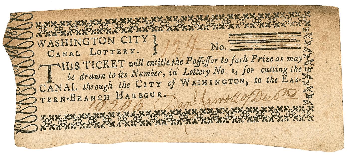 Founding Father of the United States (1730-1796). He was a prominent member of one of America's great colonial families that included his cousin Charles Carroll of Carrollton who signed the Declaration of Independence, and his brother John Carroll who was the first Catholic bishop in the United States. He was one of only five men to sign both the Articles of Confederation and the Constitution of the United States. Printed 4 x 2 lottery ticket, circa early 1790s, completed in manuscript. An early American lottery ticket issued to help fund the Washington City Canal "for cutting the Canal through the City of Washington to the Eastern-Branch Harbour." Numbered in manuscript and signed at the bottom by Daniel Carroll. Irregular edges, a few tiny holes, mild toning and soiling (heavier along the top edge), otherwise fine condition. Carroll was Commissioner of the District of Columbia after serving as a delegate to the Continental Congress and signing the Articles of Confederation in 1781. George Washington, a friend of Carroll, appointed him one of three commissioners to survey and limit a part of Washington D.C. Carroll served as Commissioner until 1795, when his age and poor health caused him to resign. Thus, the ticket can be dated no later than 1795.