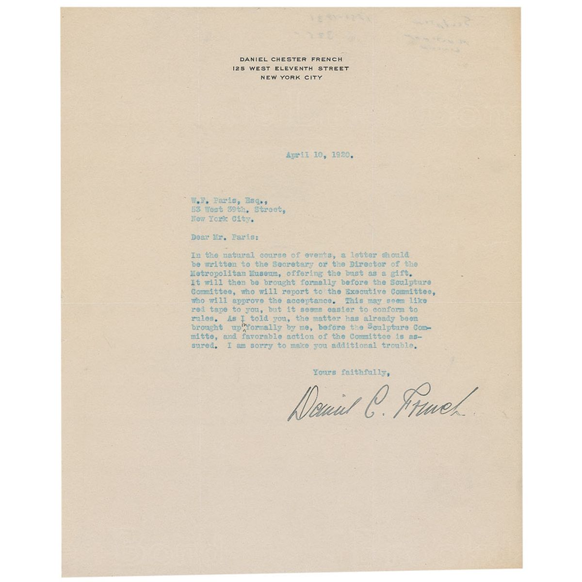 TLS signed “Daniel C. French,” one page, 8.5 x 10.5, personal letterhead, April 10, 1920. In a letter to W. F. Paris, Esq., French writes, in full: “In the natural course of events, a letter should be written to the Secretary or the Director of the Metropolitan Museum, offering the bust as a gift. It will then be brought formally before the Sculpture Committee, who will report to the Executive Committee, who will approve the acceptance. This may seem like red tape to you, but it seems easier to conform to rules. As I told you, the matter has already been brought up informally by me, before the Sculpture Committee, and favorable action of the Committee is assured. I am sorry to make you additional trouble.” Intersecting folds, one passing through the middle initial of the signature, light surface creasing, and light toning around the edges, otherwise fine condition.