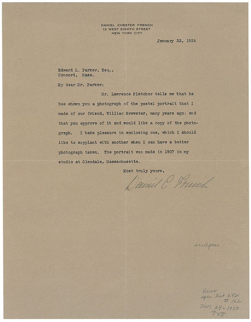American sculptor (1850–1931) best known for his monumental historical works, most notably the sculpture that forms the centerpiece of the Lincoln Memorial. TLS signed “Daniel C. French,” one page, 8.5 x 11, personal letterhead, January 22, 1924. Letter to Edward L. Parker of Concord. In full: “Mr. Lawrence Fletcher tells me that he has shown you a photograph of the pastel portrait that I made of our friend, William Brewster, many years ago; and that you approve of it and would like a copy of the photograph. I take pleasure in enclosing one, which I should like to supplant with another when I can have a better photograph taken. The portrait was made in 1907 in my studio at Glendale, Massachusetts.” In fine condition, with central horizontal and vertical folds, an overall shade of toning, and a few pencil notations to the lower right.