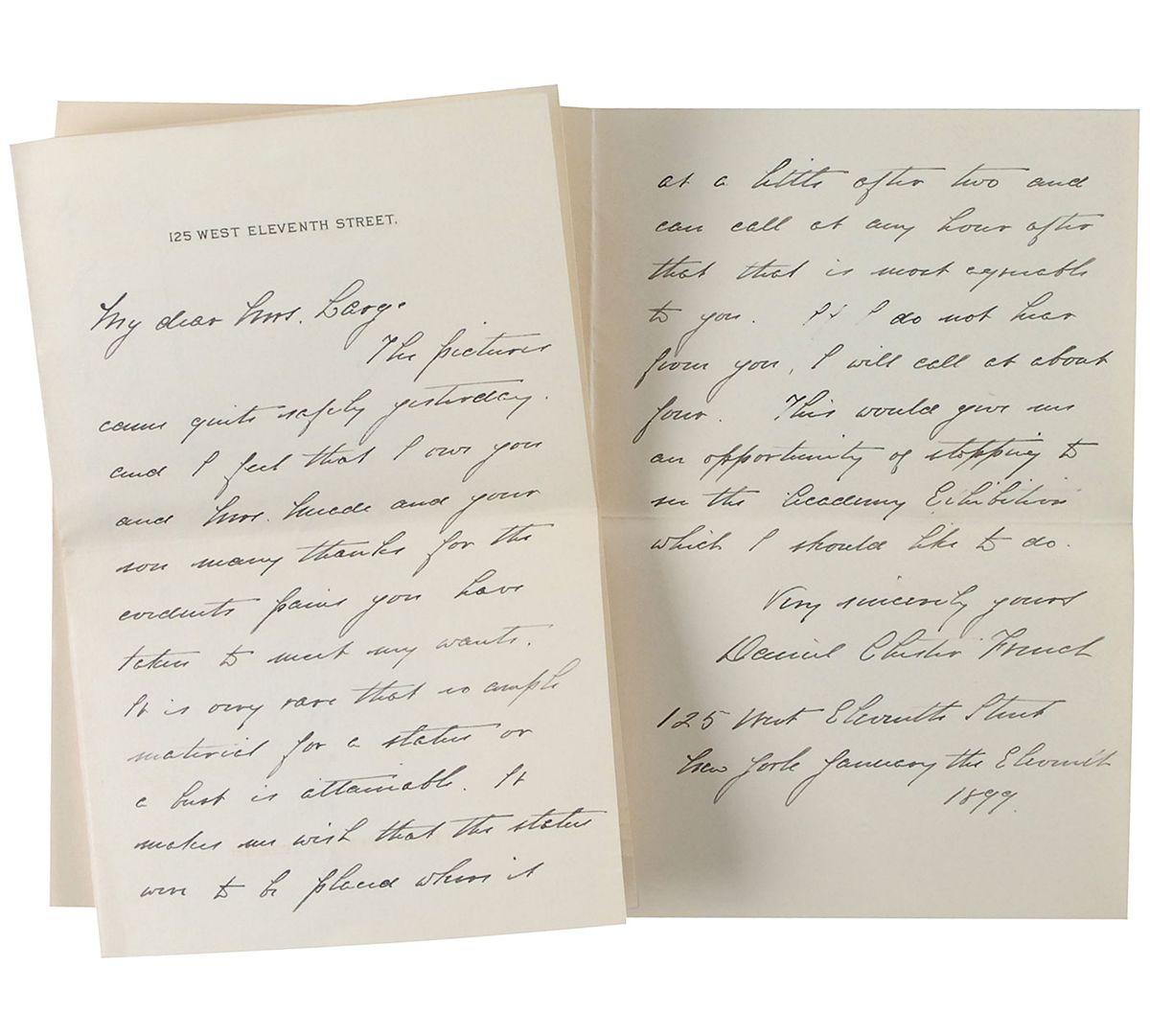 Two ALSs, each 4.5 x 7, January 11 and 24, 1899. Two letters to the same man, John Large of Philadelphia. The first, two pages on two adjoining sheets, in part: “May I come to see you next Saturday afternoon, January the fourteenth?…This would give me an opportunity of stopping to see the Academy Exhibition which I should like to do.” The second, three pages on two adjoining sheets, in part: “The pictures came quite safely yesterday…it is very rare that so ample material for a statue or bust is attainable. It makes me wish that the statue was to be placed where it could be experienced in detail…I have already begun my study in clay…The print of the Hicks portrait gives me all the points I desire.” In overall very fine condition. Both are accompanied by their original mailing envelopes, filled out in French’s hand.