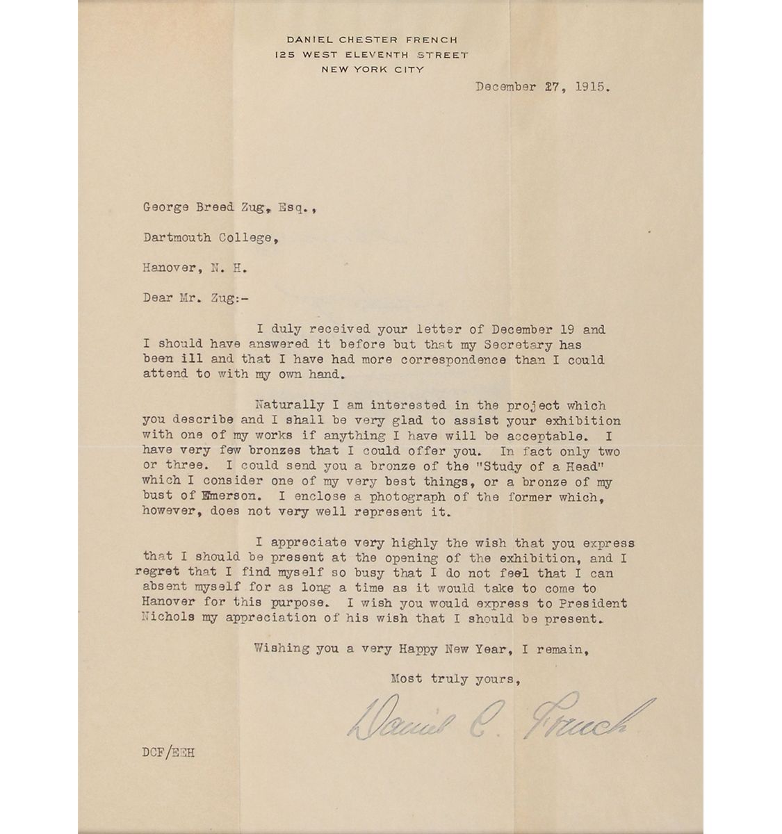 American sculptor (1850–1931) best known for his monumental historical works, most notably the sculpture that forms the centerpiece of the Lincoln Memorial. TLS signed “Daniel C. French,” one page, 7 x 9.25, personal letterhead, December 27, 1915. Letter to George Breed Zug at Dartmouth College. In part: “Naturally I am very interested in the project which you describe and I shall be very glad to assist your exhibition with one of my works if anything I have will be acceptable. I have very few bronzes that I could offer you. In fact only two or three. I could send you a bronze of ‘Study of a Head’ which I consider to be one of my very best things, or a bronze of my bust of Emerson.” Double-matted and framed to an overall size of 12.25 x 14.5. Intersecting folds (one vertical fold passing between his middle initial and last name), and light toning, otherwise fine condition.
