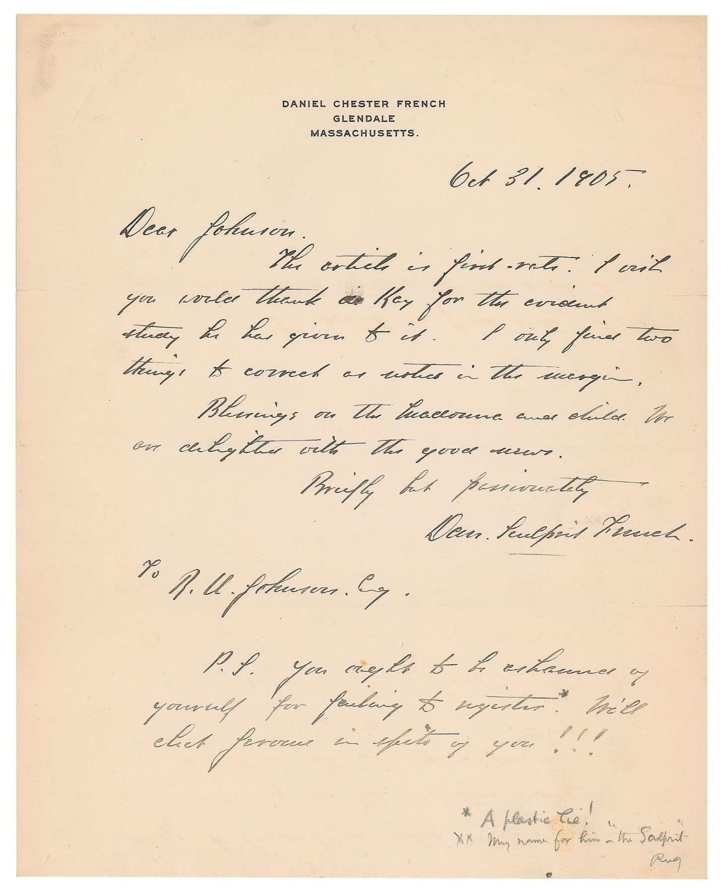 American sculptor (1850–1931) best known for his monumental historical works, most notably the sculpture that forms the centerpiece of the Lincoln Memorial. ALS signed “Dan. Sculprit French,” one page, 8 x 10, personal letterhead, October 31, 1905. Letter to Robert Underwood Johnson, editor of The Century Magazine, in full: "The article is first-rate. I wish you would thank Kay for the evident study he has given to it. I only find two things to correct as noted in the margin. Blessings on the Madonna and child. We are delighted with the good news…P.S. You ought to be ashamed of yourself for failing to register. We'll elect Jerome in spite of you!!!" In the lower corner in pencil, Johnson notes: "A plastic lie! xx My name for him, 'the Sculprit,' RUJ." In fine condition, with a short split the end of one of the folds. Accompanied by the original Goodspeed's Book Shop folder. This letter is presumably in reference to Charles De Kay's article, 'French's Groups of the Continents,' which appeared in The Century Magazine in January 1906, a story about the four marble groups ('America,' 'Europe,' 'Asia,' and 'Africa') sculpted by French for the front of the New York Custom-House.