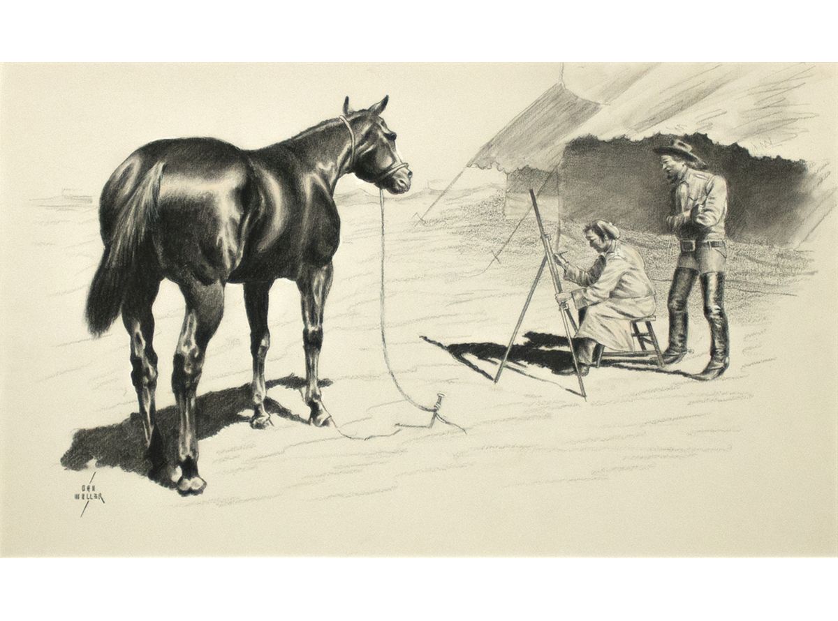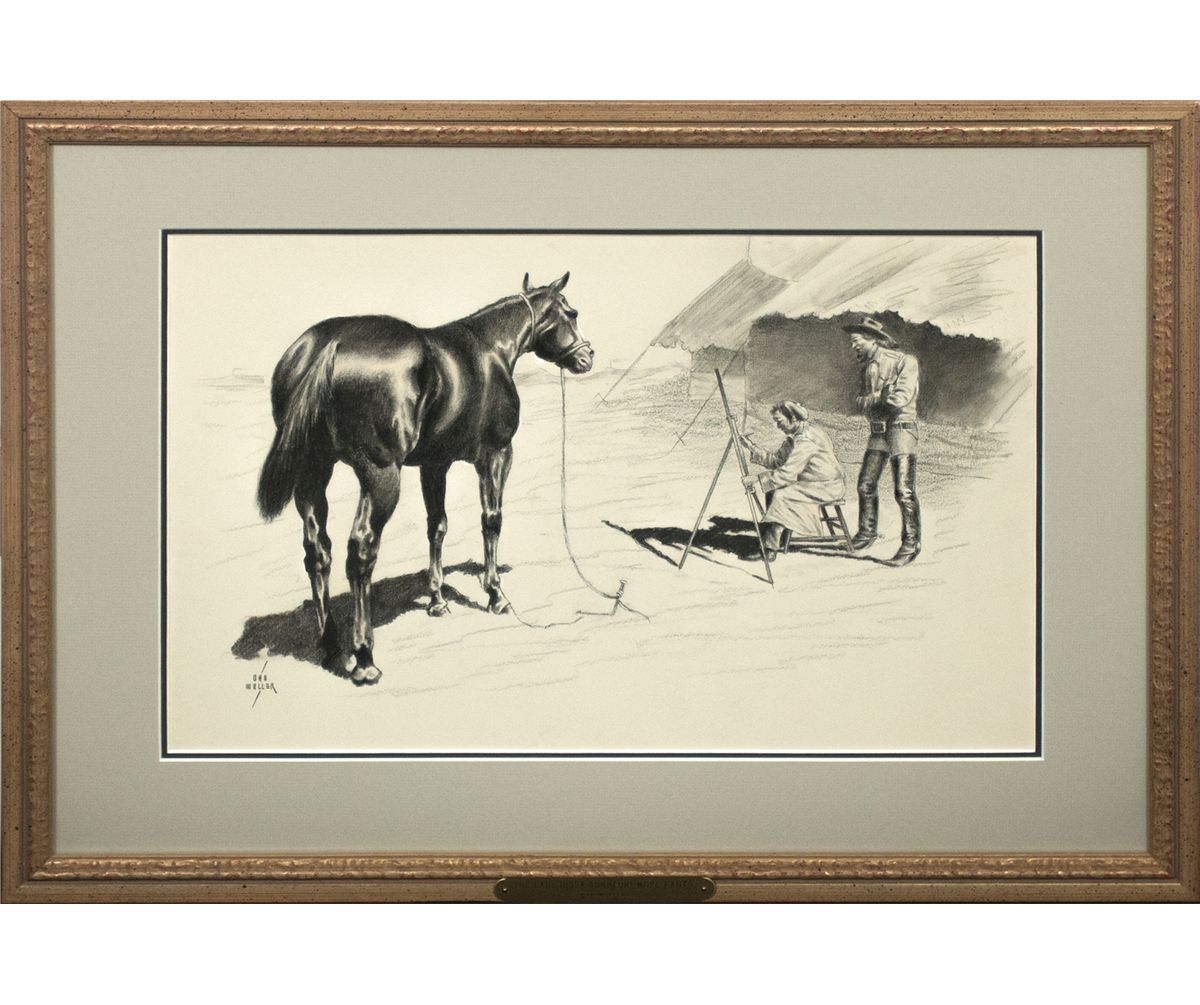 Daniel Cody Muller (1889 - 1977). The Lady (Rosa Bonheur) Wore Pants. 11.5" x 17.5" charcoal. Signed lower left: DAN MULLER. Provenance: The S. George & Helen Binson Estate, donated to the Cheyenne Frontier Days Old West Museum, Cheyenne, WY.