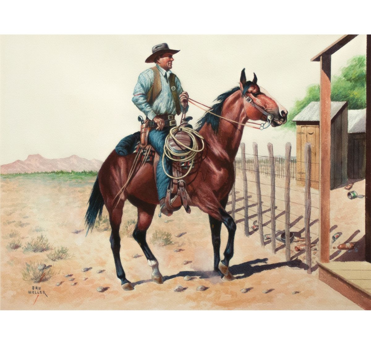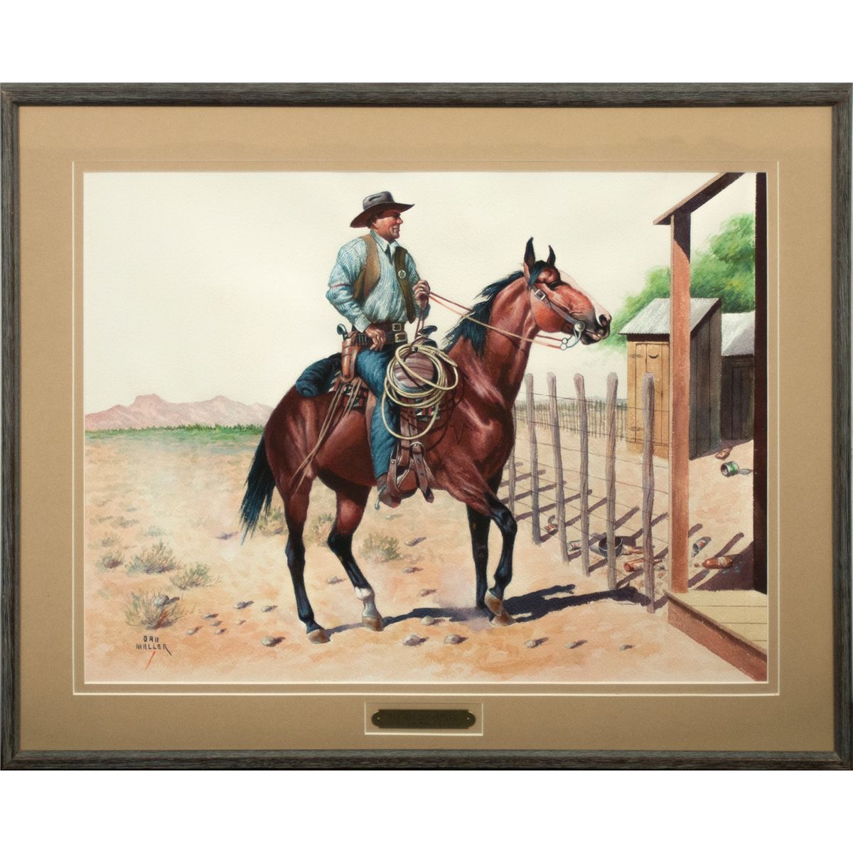 Daniel Cody Muller (1889 - 1977). The Sheriff Calls. 18" x 24" watercolor & gouache. Signed lower left: DAN MULLER. Provenance: The S. George & Helen Binson Estate, donated to the Cheyenne Frontier Days Old West Museum, Cheyenne, WY.