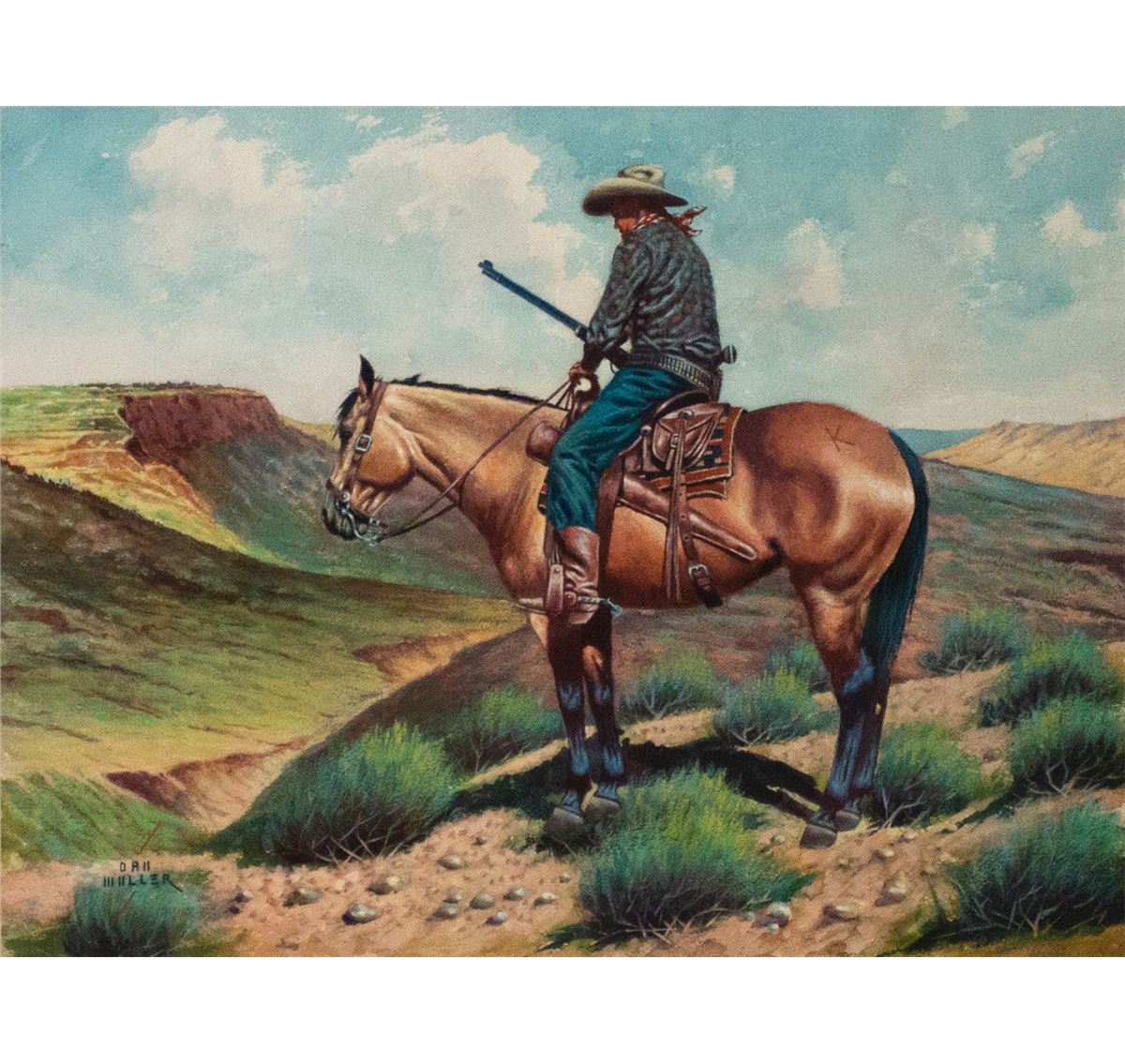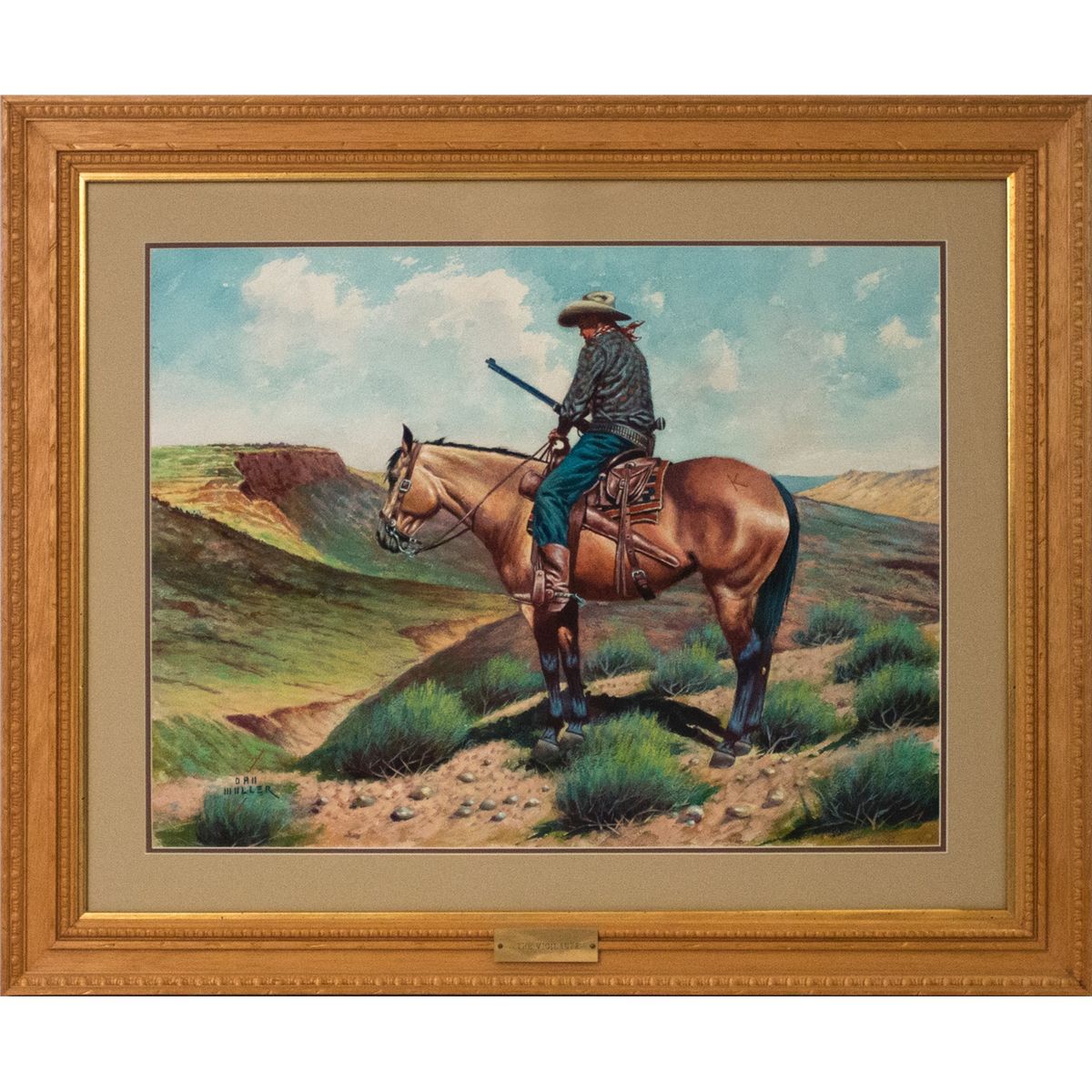 Daniel Cody Muller (1889 - 1977). The Vigilante. 18" x 24" watercolor & gouache. Signed lower left: DAN MULLER. Provenance: The S. George & Helen Binson Estate, donated to the Cheyenne Frontier Days Old West Museum, Cheyenne, WY.