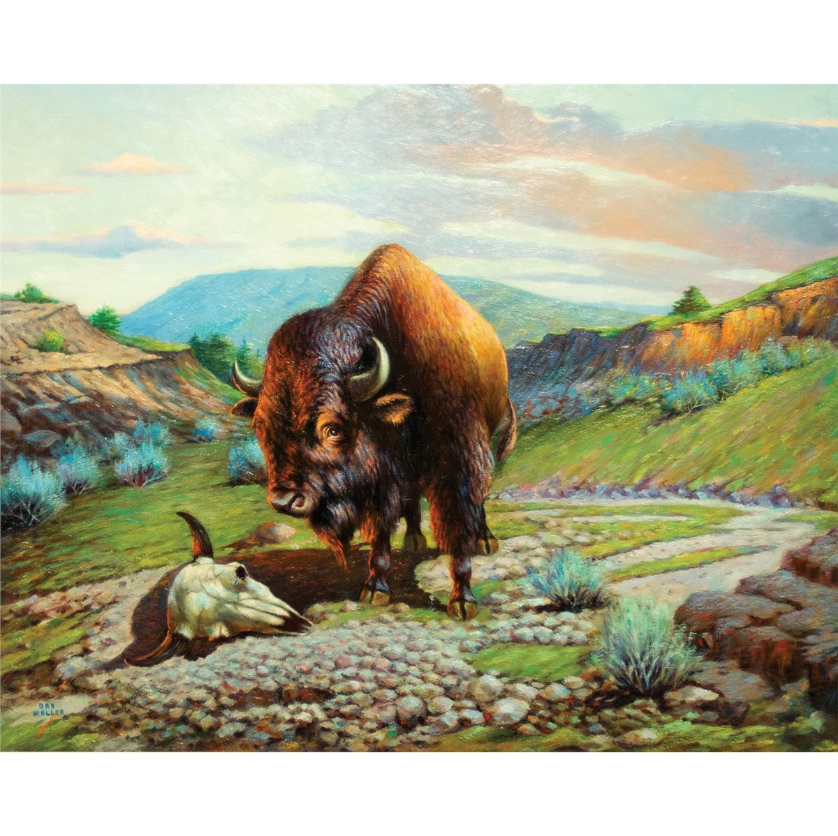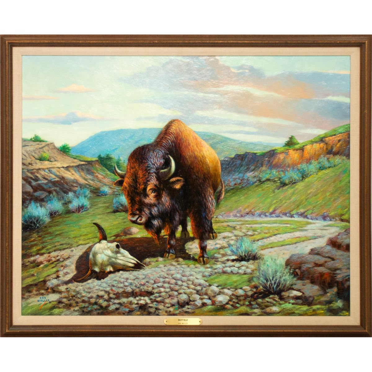 Daniel Cody Muller (1889 - 1977). Buffalo. 24" x 30" oil on canvas. Signed lower left: DAN MULLER. Provenance: The S. George & Helen Binson Estate, donated to the Cheyenne Frontier Days Old West Museum, Cheyenne, WY.
