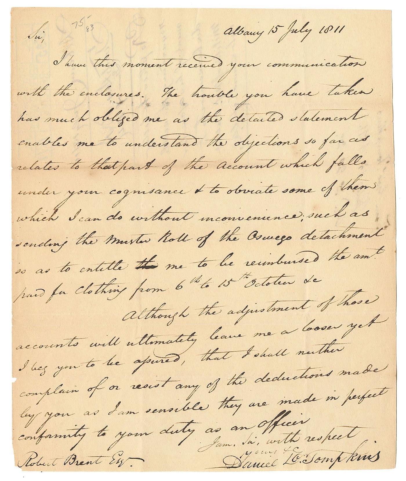 The sixth Vice President of the United States (1774–1825) who also served as the fourth Governor of New York. ALS as New York governor, one page, 8 x 9.5, July 15, 1811. Letter to Robert Brent, in full: "I have this moment received your communication with the enclosures. The trouble you have taken has much obliged me as the detailed statement enables me to understand the objections so far as relates to that part of the account which falls under your cognisance & to obviate some of them which I can do without inconvenience; such as sending the muster roll of the Oswego detachment so as to entitle me to be reimbursed the am't paid for clothing from 6th to 15th October etc. Although the adjustment of those accounts will ultimately leave me a looser yet I beg you to be assured, that I shall neither complain of or resist any of the deductions made by you as I am sensible they are made in perfect conformity to your duty as an officer." In fine condition.