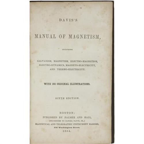 <B>[Daniel Davis, Jr.] </B></I><B><I>Davis's Manual of Magnetism,</B></I></B></I> <B><I> Including Galvanism, Magnetism, Electro-Magnetism, Electro-Dynamics, Magneto-Electricity, and Thermo-Electricity</B></I></B></I><B>.</B></I> Boston: Palmer and Hall, 1854.<BR><BR>Sixth edition. Twelvemo. 322 pages. Copper-plate engraving used as frontis. Illustrations throughout text.<BR><BR>Original black cloth with decoration in blind on the boards and titles in gilt on the spine. Extremities shelf worn with abrasion to upper front corner. Joints starting to crack. Small areas of loss at the edge of the spine. Boards soiled. Contents tight with light foxing throughout. Old owner's signature on the second front free endpaper. Good condition.<BR><BR><BR><b>Shipping:</b> Books & Catalogs (<a target="_blank" href="http://www.heritageauctions.com/common/shipping.php">view shipping information</a>)