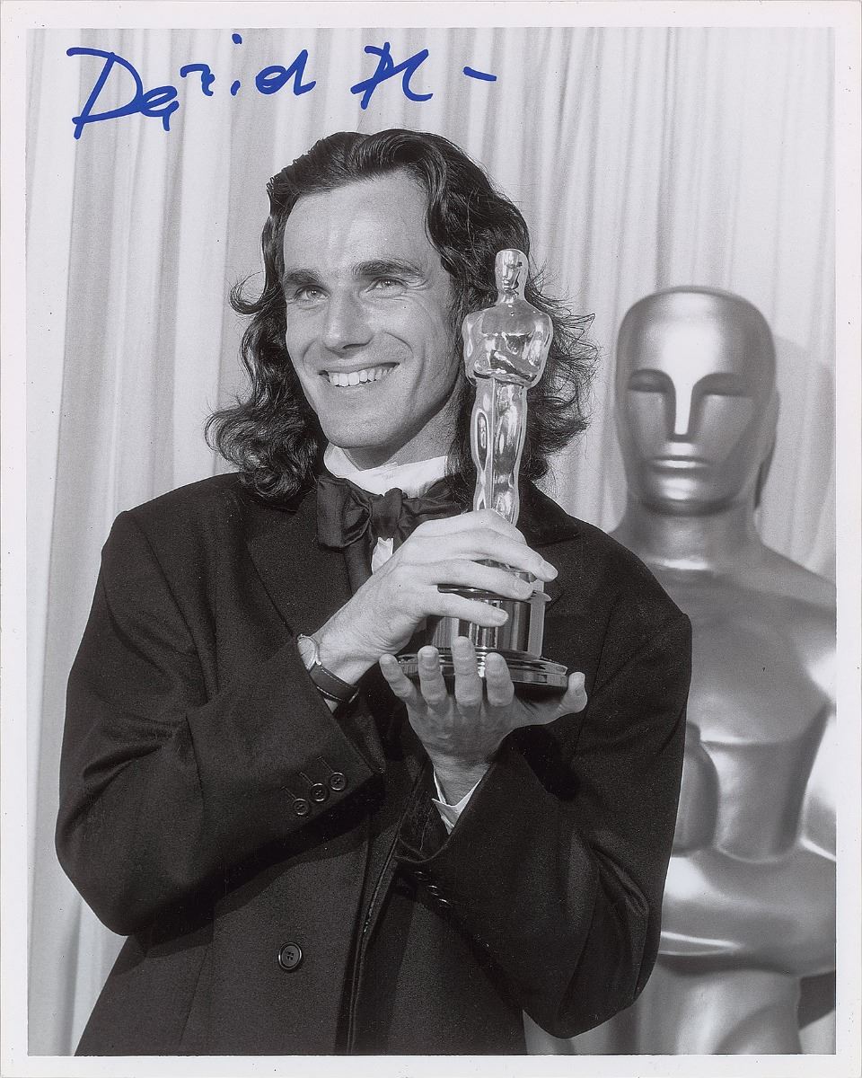 Appealing glossy 8 x 10 photo of Day-Lewis holding up his Best Actor Oscar for his role as Christy Brown in the 1989 film My Left Foot, signed in blue felt tip, “Daniel DL.” Reverse bears an AMPAS stamp. In very fine condition.