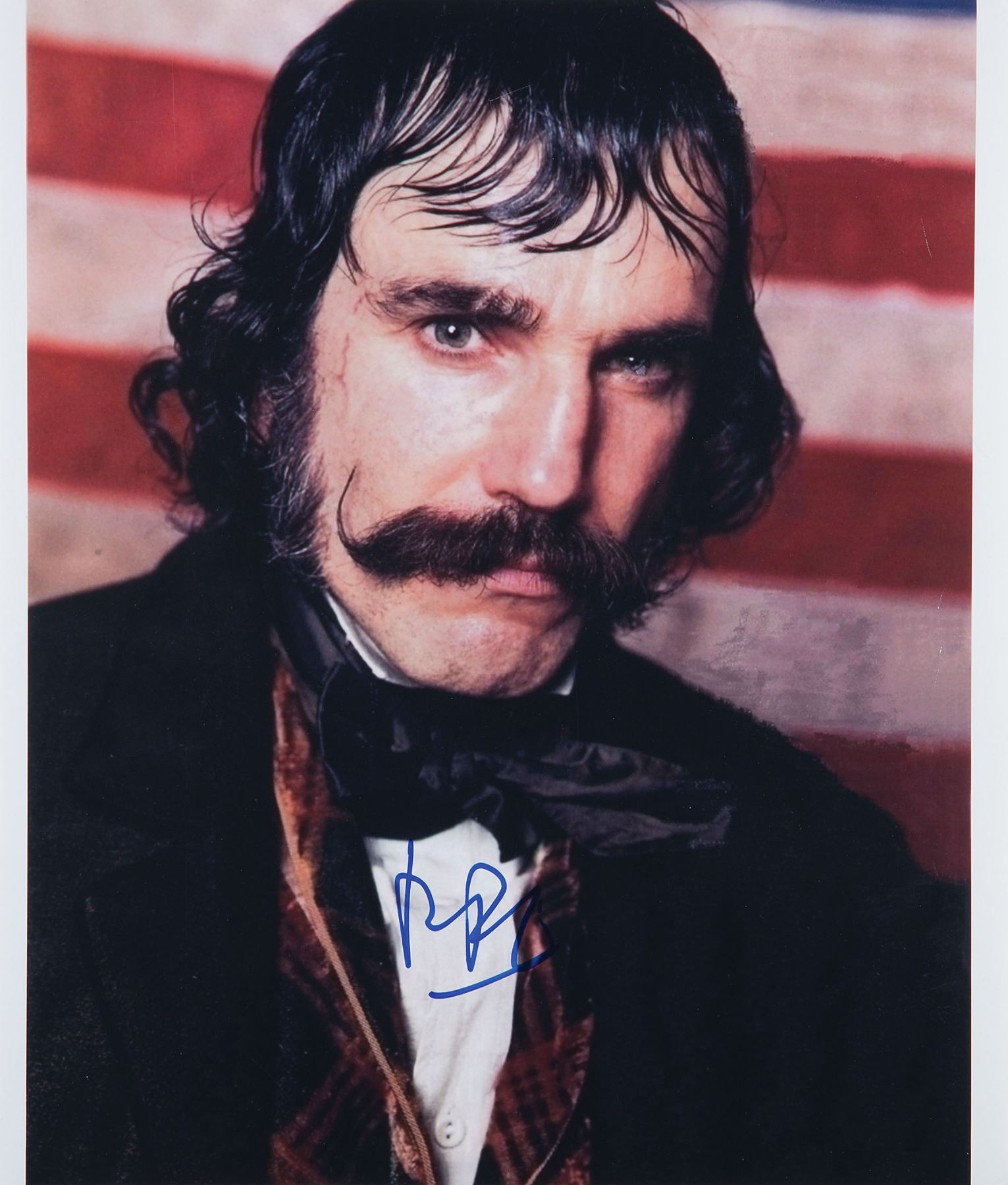 Color satin-finish 12 x 14 close-up photo of Daniel Day-Lewis as William 'Bill the Butcher' Cutting in the 2002 period film Gangs of New York, signed in blue felt tip, "DDL." In very good to fine condition, with scattered light creasing, and a somewhat heavier crease passing through his right eye.