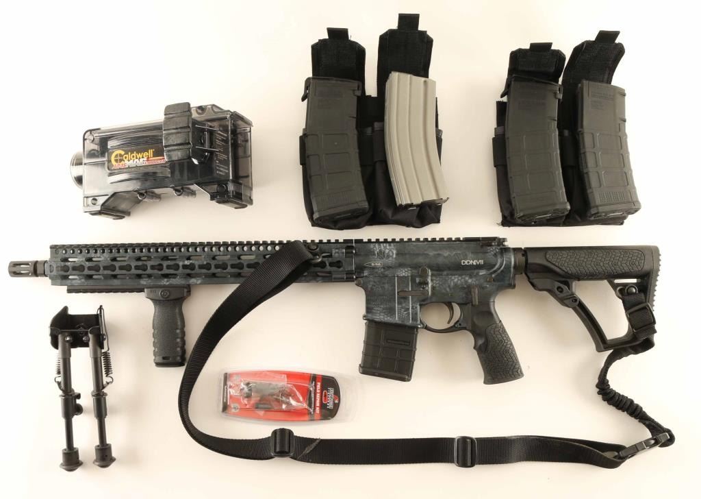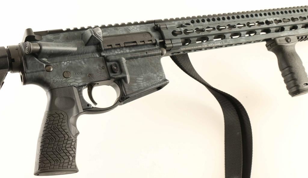 High quality AR-15 pattern semi-automatic modern sporting rifle chambered in 5.56mm Nato. Features a Kryptek Typhon finish, cold hammer forged 16" chrome moly vanadium 1:7 twist government profile barrel, factory flash suppressor, CNC machined 7075-T6 aluminum receiver set, polymer dust cover, shell deflector with added cushion, forward assist, 15" keymod slim rail handguard with an attached 6" rail segment & MFT RSG vertical foregrip, M16 profile bolt carrier, standard fire control group, standard charging handle, 20 round ProMag magazine, Troy Industries black nylon sling, factory glass filled polymer pistol grip with soft touch overmolding and telescoping six position shoulder stock . Includes a Drago Gear tactical 36" single gun case with manual, Sight Mark magnifier on slide to side mount, four spare magazines, bipod, Bushmaster field repair kit, and Caldwell AR-15 Mag Charger. Rifle exhibits approximately 97% original finish showing some light wear on the upper receiver rail and small scattered losses. Action is smooth, the bore is excellent and the synthetic stocks are fine. Condition is near NRA Excellent. ***Modern Firearm***