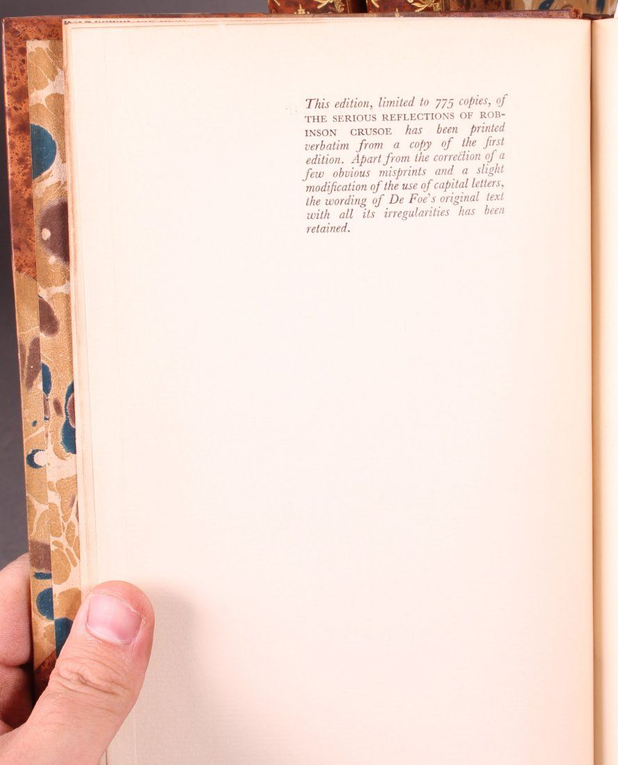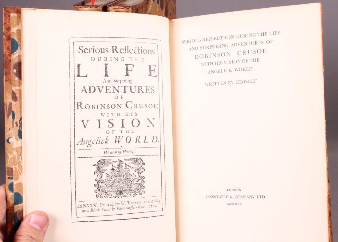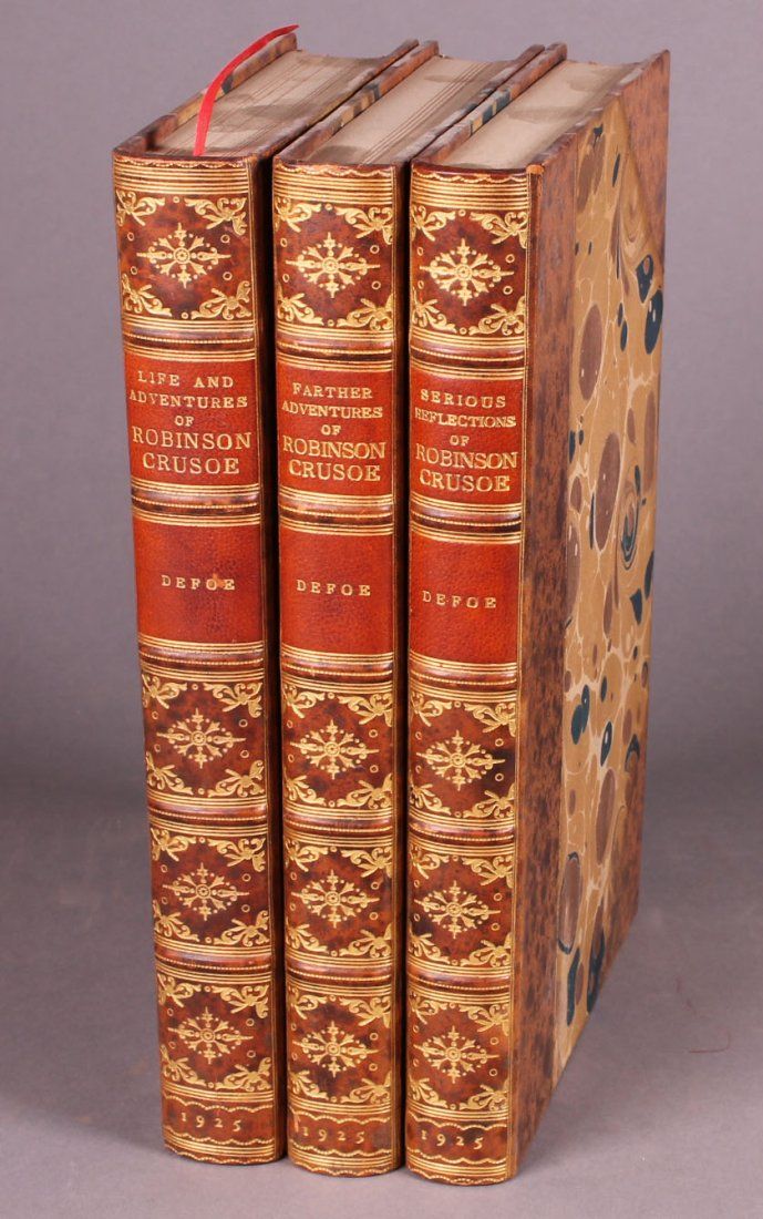 [Defoe, Daniel]. 3 Titles. ++ THE LIFE AND STRANGE SURPRISING ADVENTURES OF ROBINSON CRUSOE Of York, Mariner. ++ THE FARTHER ADVENTURES OF ROBINSON CRUSOE. ++ SERIOUS REFLECTIONS DURING THE LIFE AND SURPRISING ADVENTURES OF ROBINSON CRUSOE with his Vision of the Angelick World. ++ Lon: Constable and Company, 1925. 8vo. Recent half tree calf and marbled board, 6-panel gilt-decorated spines, marbled eps. One of 775.
