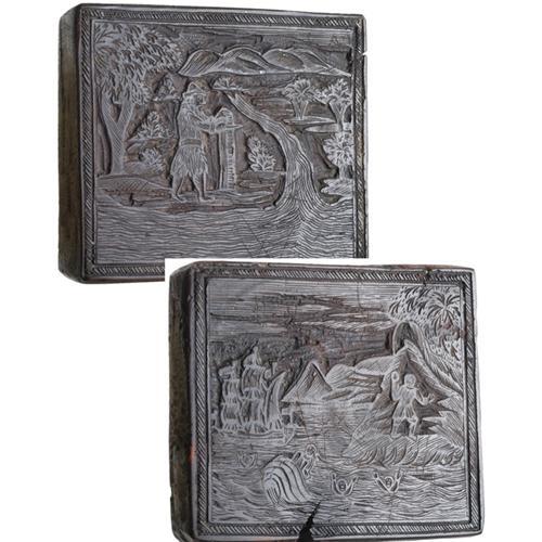 <Our item number 140987><B>Defoe, Daniel.</B> <I>Robinson Crusoe.</I> Two original, hand-engraved, 2½ x 2¾ in. dark wooden printing blocks for two scenes in a chap-book edition of Daniel DeFoe's Robinson Crusoe, c. 1700s. The first depicts a shipwreck on a tropical coast, with four men drowning in the ocean while another stands on shore. The second block depicts Crusoe at his record-keeping pillar, located where a river meets the sea. According to "Chap-Books of the Eighteenth Century," these blocks are not from the full length version of DeFoe's "The Life and Strange Surprising Adventures of Robinson Crusoe," but are from some chap-book printing in the 1700s, which does match their style. Both blocks have the same diagonal lined border, indicating that both are likely from the same chap-book. Both are clear and in nice condition, with a trivial crack in the upper right on the record-keeping block, and a larger ¼ in. crack in the bottom of the shipwreck block. Neit her is signed by the engraver or printer, however, a search through chap-books of the 1700s should reveal which book these blocks were made for. Accompanied by some pages from "Chap-Books of the Eighteenth Century" illustrating some cuts from 1700s chap-book editions of "Robinson Crusoe." <BR>Estimated Value $1,000 - 2,000. <BR><BR>Our item number 140987<BR><IMAGES><P ALIGN="CENTER"><IMG SRC="http://www.goldbergcoins.net/liveauction/49jpegs/140987.jpg"> </P></IMAGES>