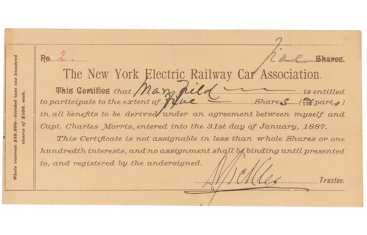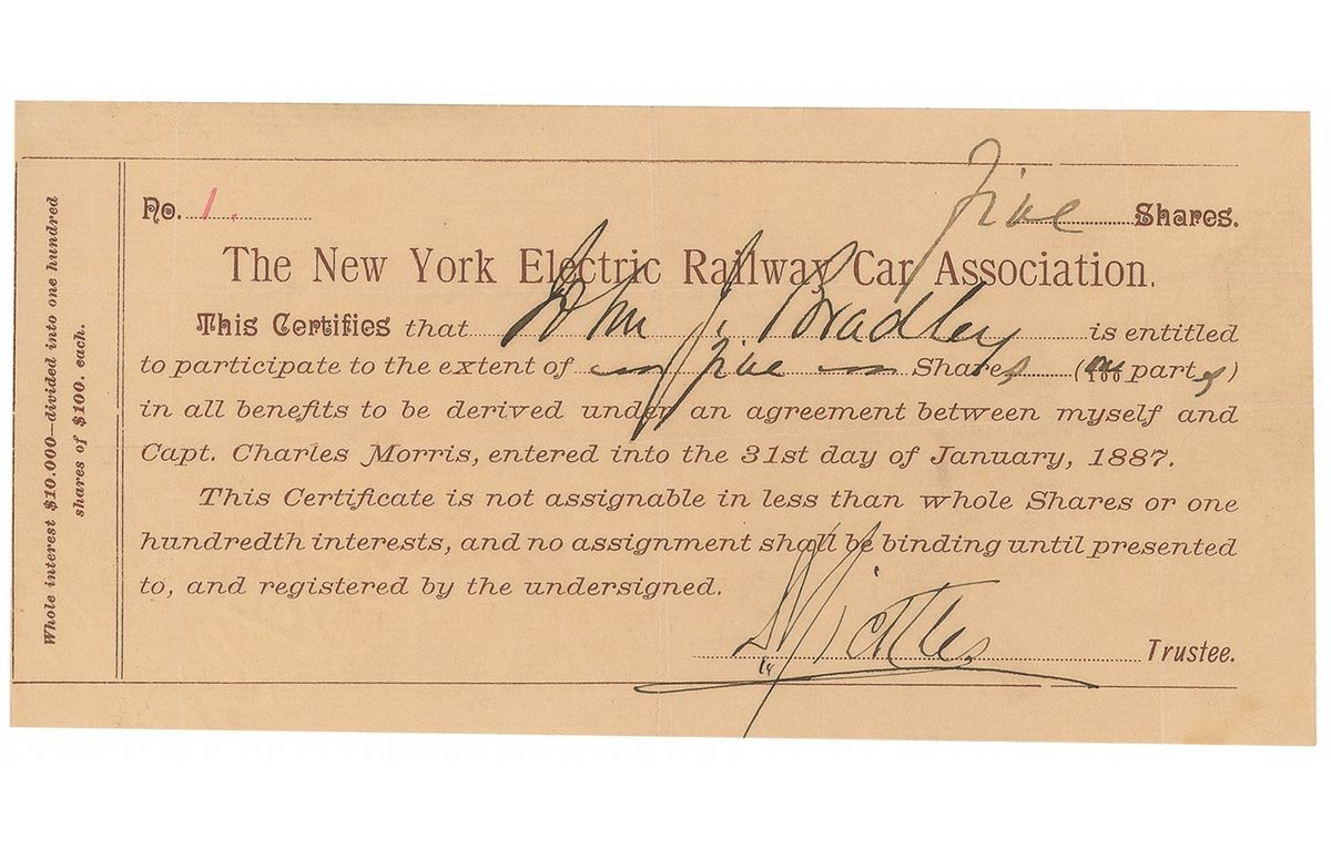 Controversial and colorful American politician and military officer (1819–1914). After discovering his wife was having an affair, Sickles shot the man, the son of Francis Scott Key, and secured an acquittal with the a temporary insanity defense. During the Civil War, Sickles served as a general and lost his leg at the Battle of Gettysburg. Two certificates for five shares in the New York Electric Railway Car Association, 7.5 x 3.75, each signed in ink by trustee, “D. Sickles.” In fine condition, with intersecting folds, light toning, and a small tear to the top edge of one certificate. Accompanied by an ALS, signed by “L. A. Gaff,” informing “Messrs. Stays & Greenbaum” that they have been “authorized to deduct from the interest to be collected by you of Genl. Sickles the sum of one hundred dollars.”