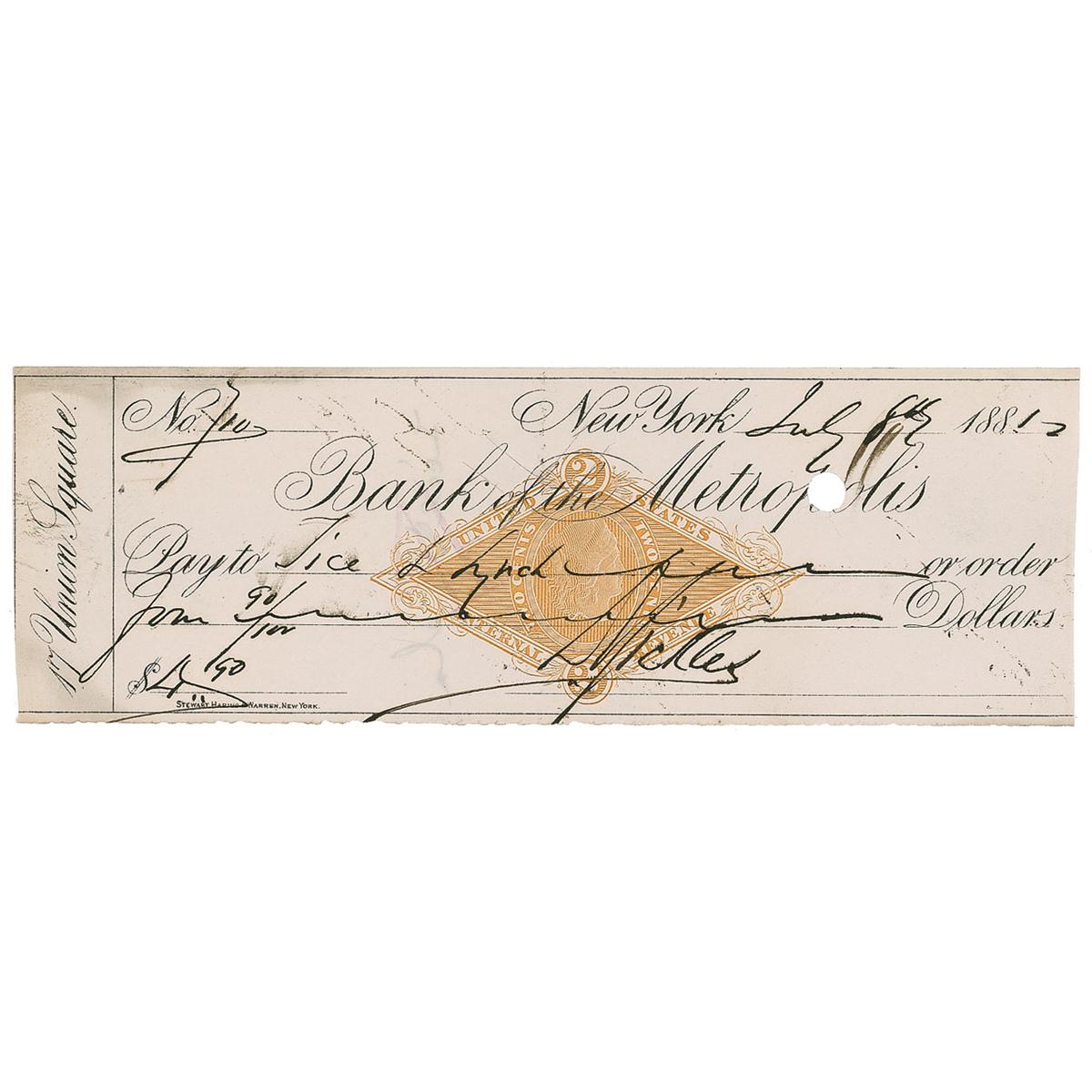 Bank check, 7.75 x 2.5, filled out and signed “D. Sickles,” payable to Tice & Lynch for $4.90, July 8, 1881. In fine condition, with light soiling, and usual bank cut and punch cancellations (away from signature).
