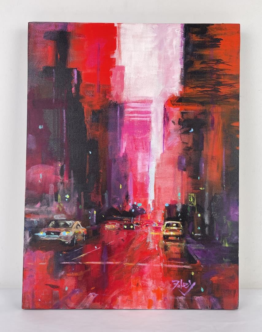 18" by 24". Title is "New York Minute". Hamilton Montana Native. Student of New Mexico Artist Bruce DeFoor. Daniel takes his inspiration from the old masters of painting. His works are reminiscent of Taos artists. Using an array of light and color, Daniel is able to make his paintings come alive. We are proud to be the first major auction house representing this new artist.