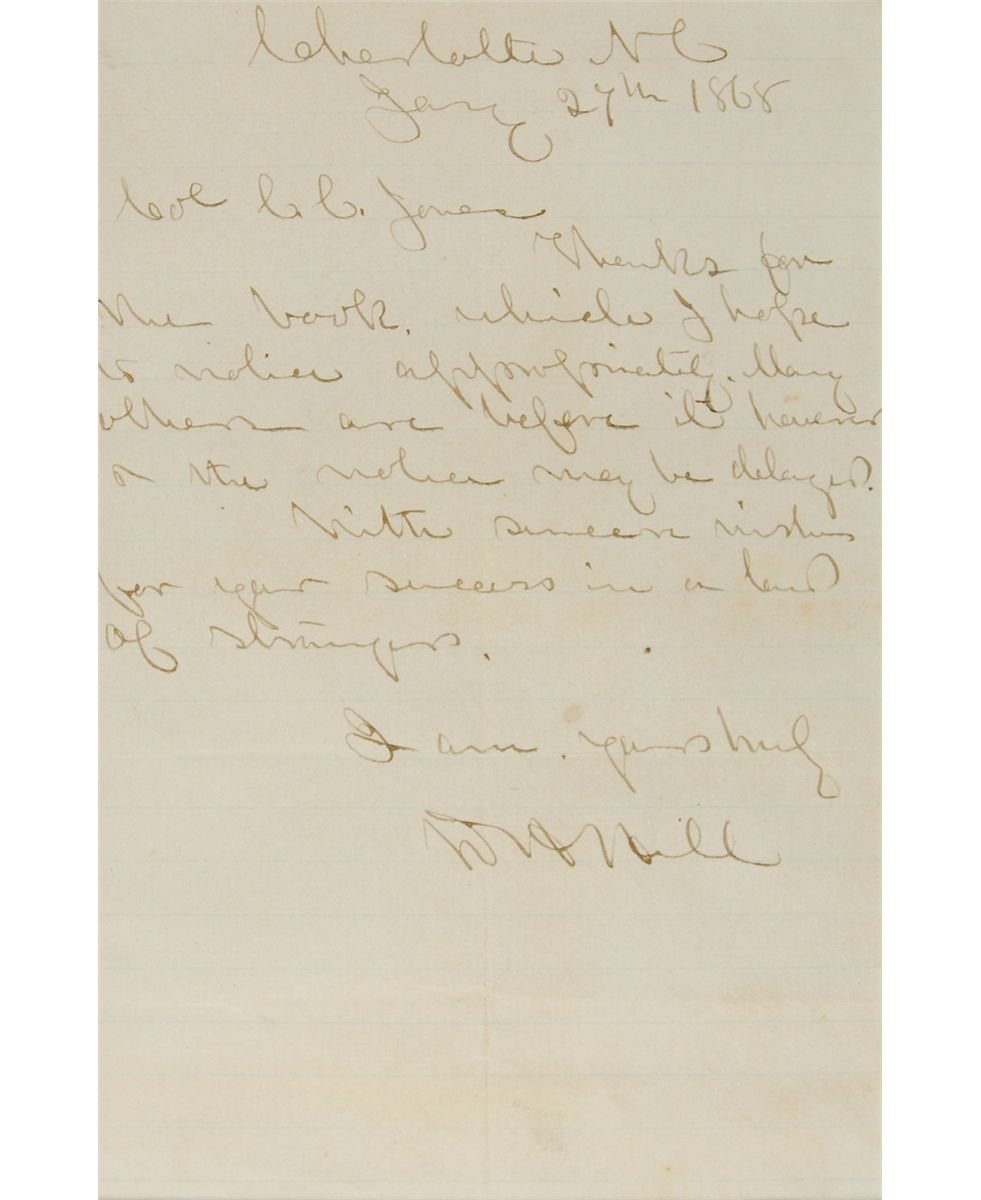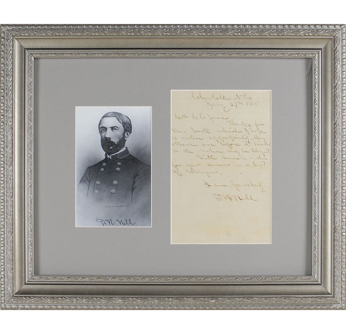 Confederate General (1821–1889) and brother-in-law of Thomas ‘Stonewall’ Jackson ALS signed “D. H. Hill,” one page, lightly-lined, 5 x 7.5, January 17, 1868. Letter to Colonel C. C. Jones. In part: “Thanks for the book…Many others are before it however…may be delayed.” Handsomely matted and framed with a portrait to an overall size of 17 x 14; there is a small crack to the glass in the upper right. In fine condition, with central vertical and horizontal folds and light toning. Colonel Charles Colcock Jones, Jr., was a politician and historian from Georgia who was mayor of Savannah immediately prior to Sherman's March to the Sea. He became a prominent memorialist of the Lost Cause and critic of the New South, publishing nearly one hundred works with a primary focus on the history of Georgia.