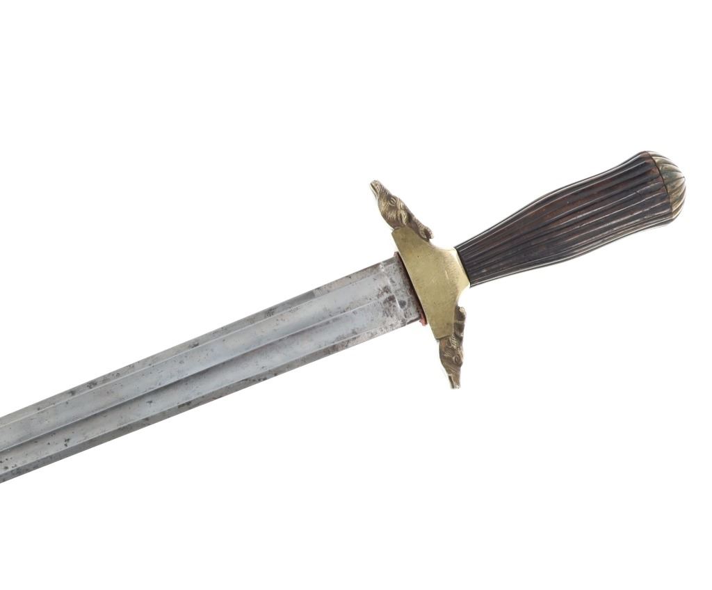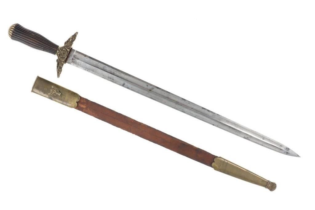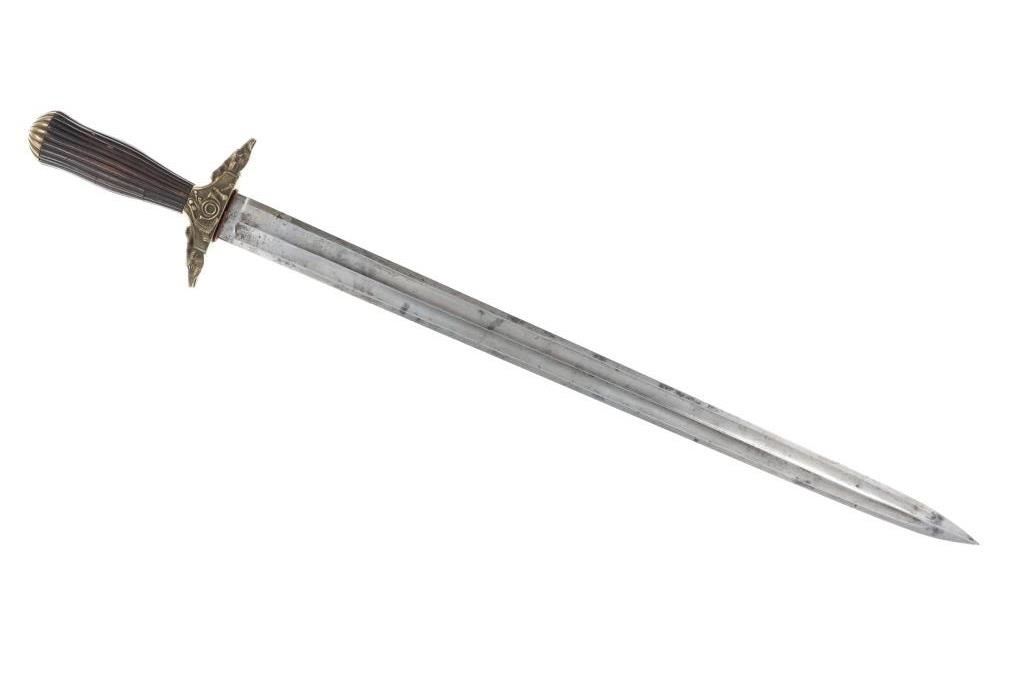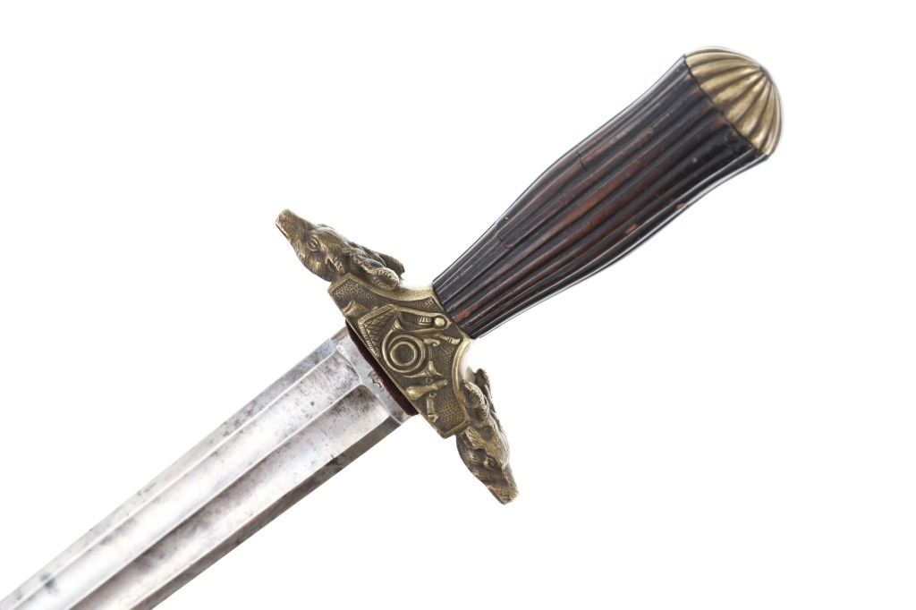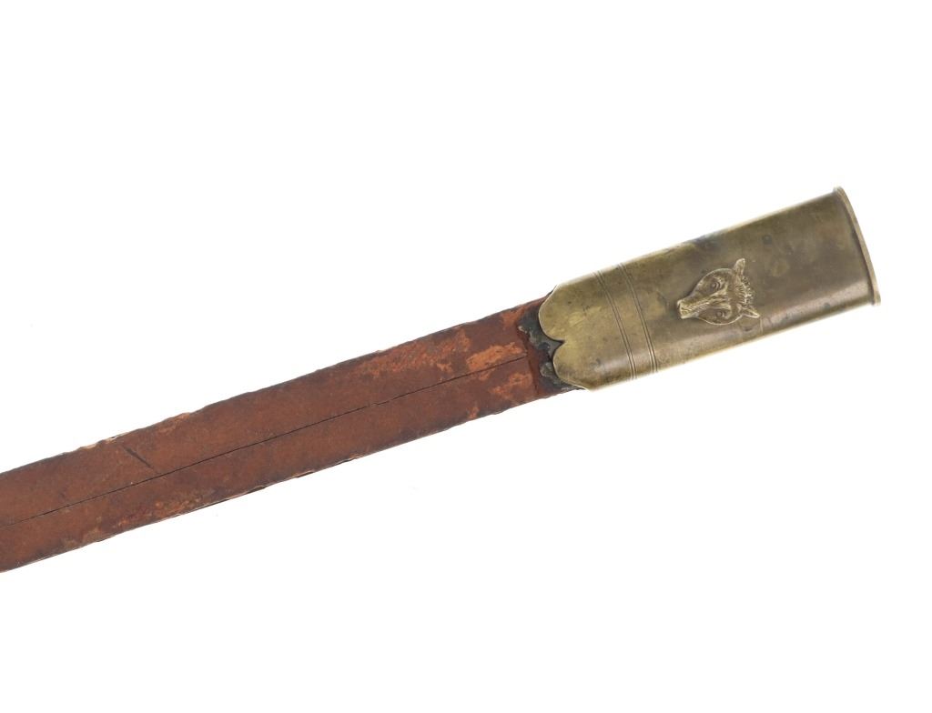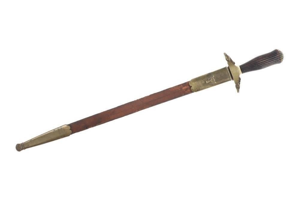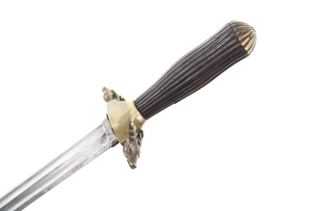 Featured in this lot is a Daniel Hartkopf & Co. German hunting hanger, circa 1870 to 1910. The hunting hanger features a wonderfully and professionally crafted steel with brass hilt and sheath. The decorated piece has a leather sheath and a vertical striation decorated wooden handle. The hilt shows a double stag head with floral decorations and the sheath shows a wolf's head. The "DH" inside a shield mark is associated with the sword maker Daniel Hartkopf & Co., a German manufacturer based in Solingen. Solingen is a renowned center for the production of knives, swords, and other edged weapons, often referred to as the "City of Blades." A hunting hanger is a type of short sword or large knife that was commonly used in the 17th and 18th centuries, particularly by hunters and outdoors men. The hunting hanger represents an important piece of hunting and military history, blending practicality with the status and aesthetics of the time. Hartkopf's swords and other edged weapons were likely used by military personnel and could be found in both civilian and military markets. The condition of this German Hunting Hanger is well preserved with some slight wear to the handle and patina adorning the blade and the hilt of the blade with the sheath in poor condition with wear to the leather, but otherwise it is well preserved. The measurements of this German hunting hanger are 29 1/8" x 4 1/2" x 1 1/8" and the blade length is 22 1/4". The collective weight of this hunting hanger is 1lb 14oz.*