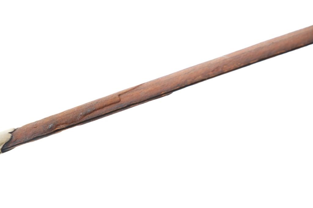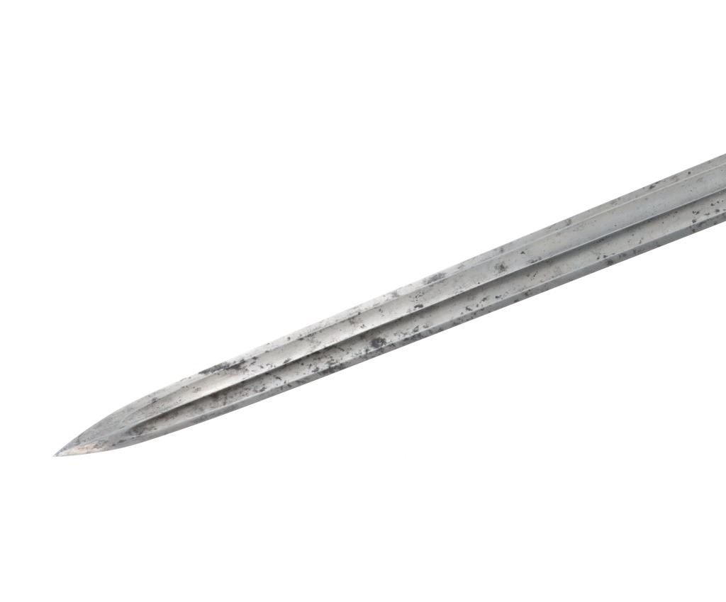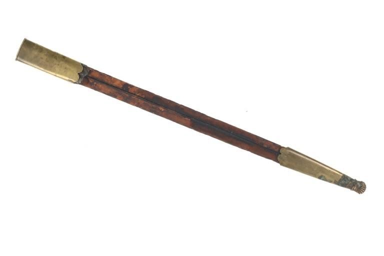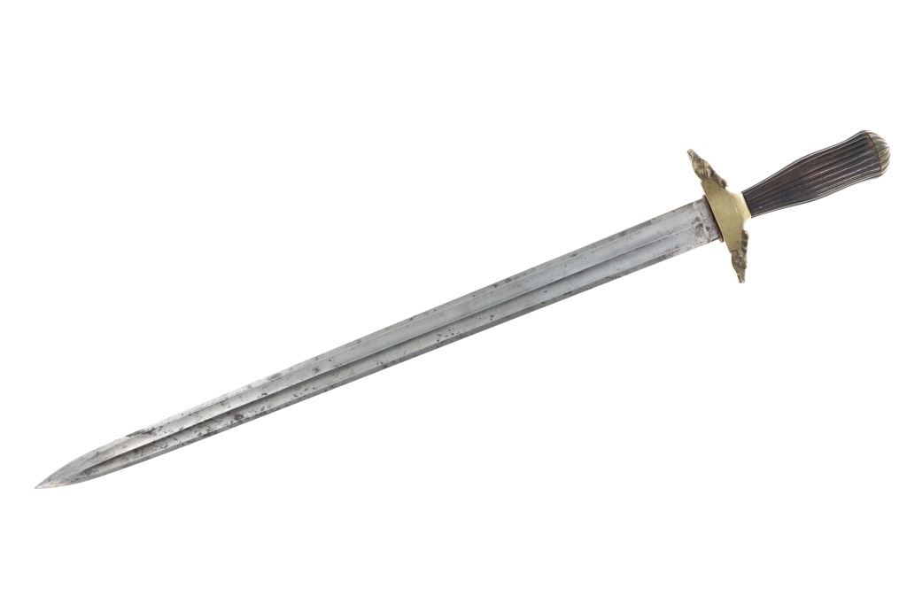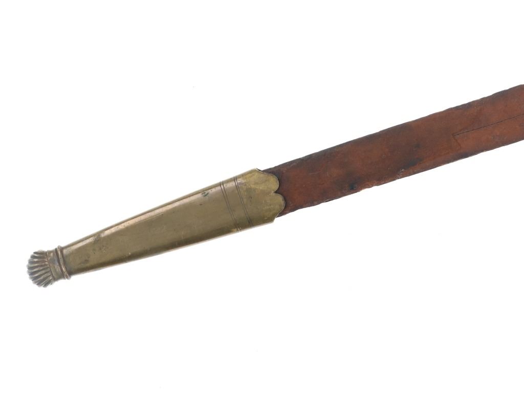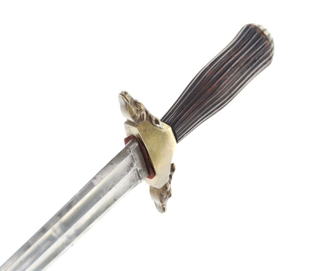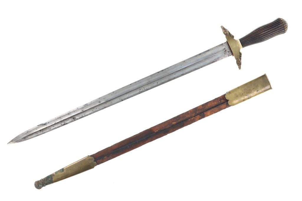 Featured in this lot is a Daniel Hartkopf & Co. German hunting hanger, circa 1870 to 1910. The hunting hanger features a wonderfully and professionally crafted steel with brass hilt and sheath. The decorated piece has a leather sheath and a vertical striation decorated wooden handle. The hilt shows a double stag head with floral decorations and the sheath shows a wolf's head. The "DH" inside a shield mark is associated with the sword maker Daniel Hartkopf & Co., a German manufacturer based in Solingen. Solingen is a renowned center for the production of knives, swords, and other edged weapons, often referred to as the "City of Blades." A hunting hanger is a type of short sword or large knife that was commonly used in the 17th and 18th centuries, particularly by hunters and outdoors men. The hunting hanger represents an important piece of hunting and military history, blending practicality with the status and aesthetics of the time. Hartkopf's swords and other edged weapons were likely used by military personnel and could be found in both civilian and military markets. The condition of this German Hunting Hanger is well preserved with some slight wear to the handle and patina adorning the blade and the hilt of the blade with the sheath in poor condition with wear to the leather, but otherwise it is well preserved. The measurements of this German hunting hanger are 29 1/8" x 4 1/2" x 1 1/8" and the blade length is 22 1/4". The collective weight of this hunting hanger is 1lb 14oz.*