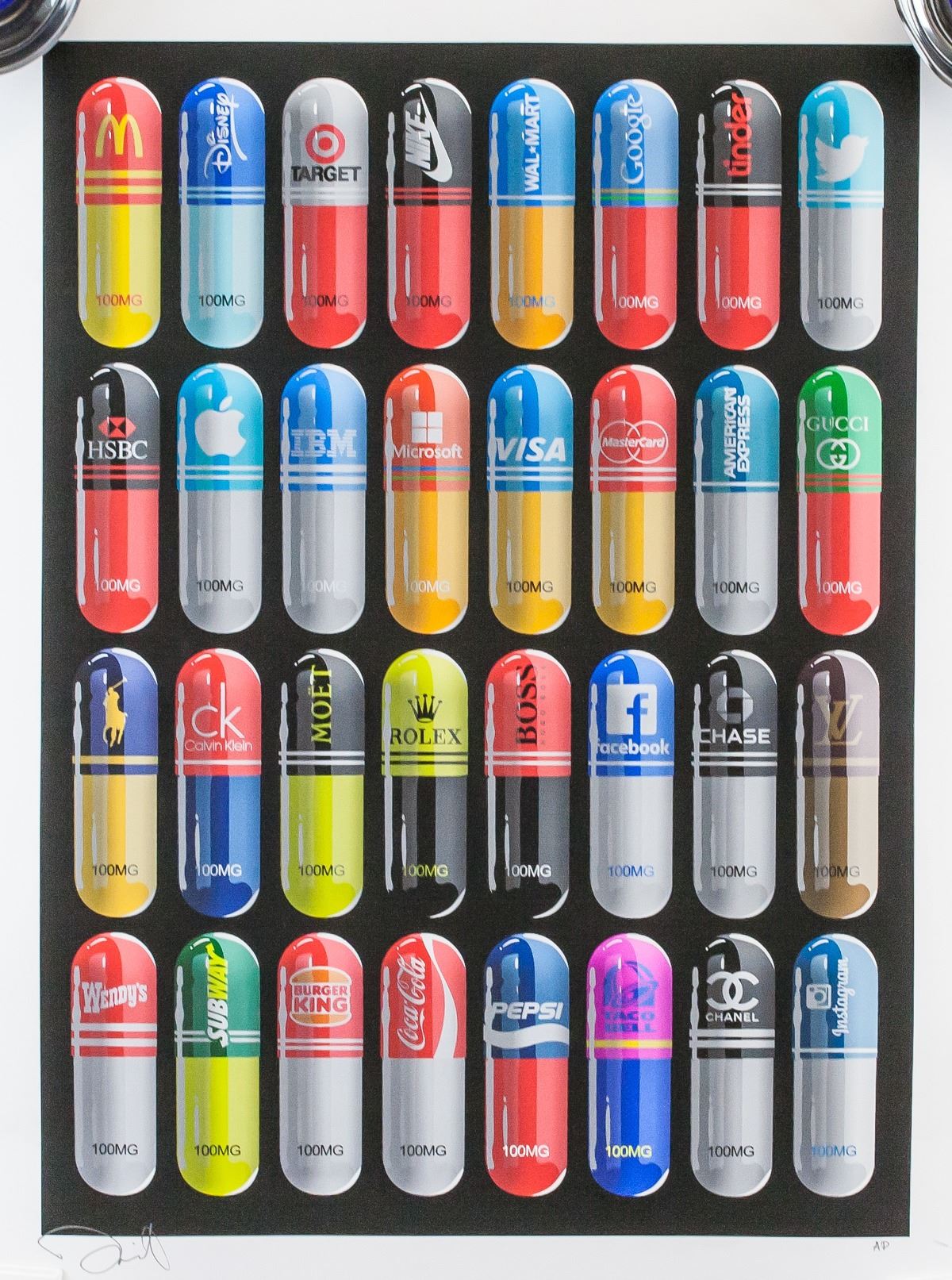 Print on paper. Featuring various major logos depicted as pill capsules. Signed "Denial" in the bottom left corner. "AD" inscribed in the bottom right corner. Attributed to Daniel Joseph Bombardier (1976- , Canadian). 61 x 46 cm. PROVENANCE: This lot carries limited provenance from a Private American collection (California)