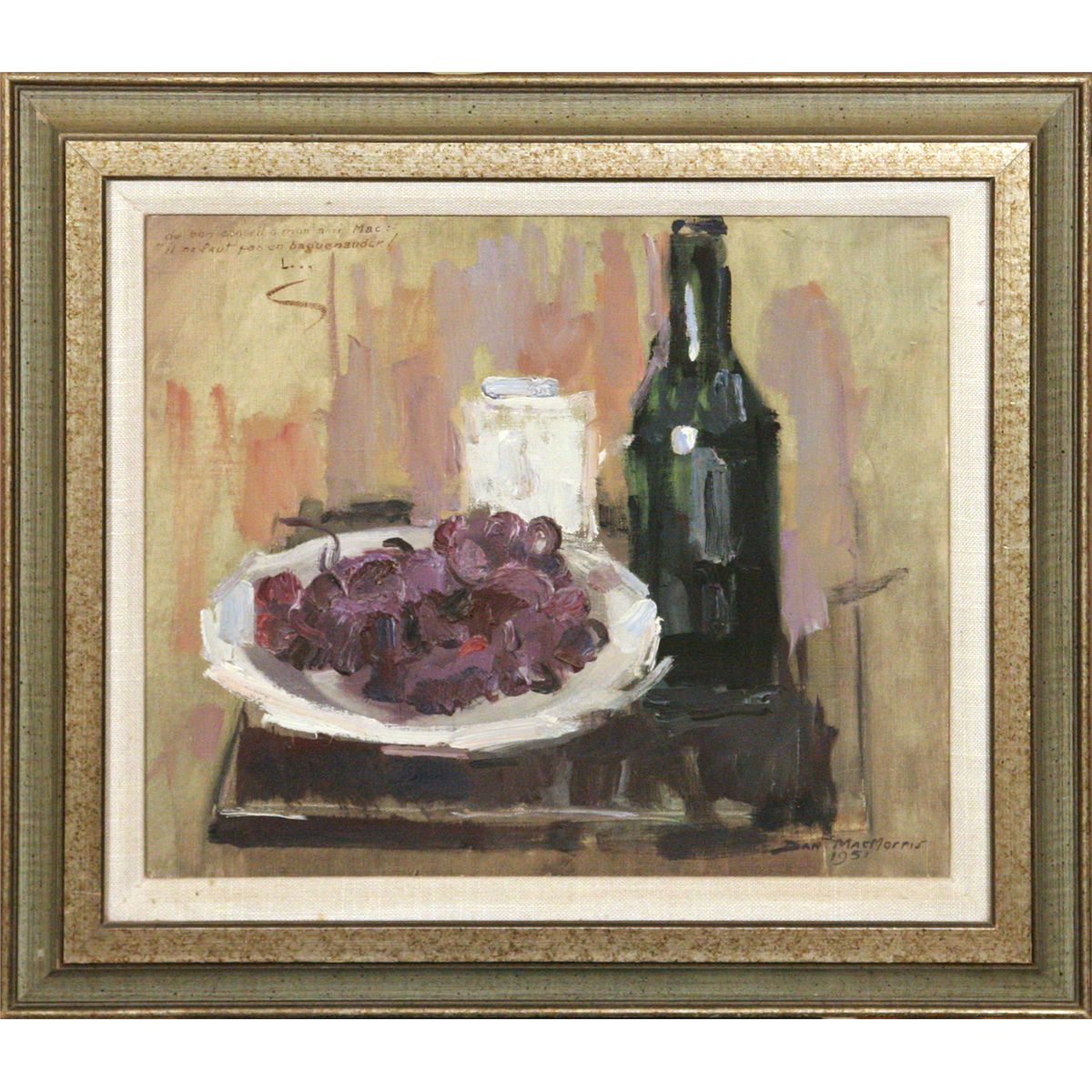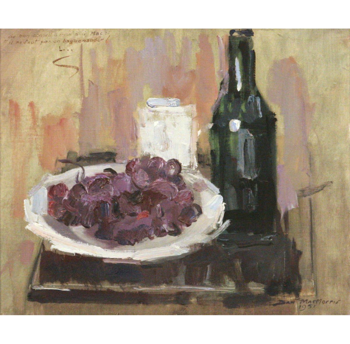 Daniel MacMorris (1893 - 1981). Still Life. 13" x 15" oil on canvas. Signed lower right: DAN MACMORRIS 1951.Inscribed upper left: du bon conseil a mon ami Mac: - il ne faut pas en baguenauder! L…