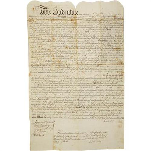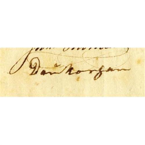 <B>Daniel Morgan Manuscript Document Signed</B></I> “<I>Dan Morgan</B></I>,” one page, 22.5” x 15”. Frederick County, Virginia, February 26, 1784. Daniel Morgan signs as one of three witnesses to a release of 306 acres of land by Martin Ashby to Edward Snickers for £500. Daniel Morgan served with the colonial forces during the French and Indian War. During the Revolutionary War, he was commissioned captain of a company of Virginia riflemen in July 1775. Morgan was taken prisoner at Quebec on December 31, 1775 and was exchanged in the fall of 1776. He was later commissioned Brigadier General in the Continental Army (1780). On January 17, 1781, Gen. Morgan overcame a superior British force by his effective use of cavalry at the battle of Cowpens, South Carolina. In 1794, he commanded federal troops ordered out by President Washington to suppress the Whiskey Rebellion in Pennsylvania. The document is scalloped at the top edge, with wear and tiny holes along folds. There is light soiling throughout and a horizontal fold repair on verso, otherwise very good condition.<BR><BR><b>Shipping:</b> Flat Material, Small (<a target="_blank" href="http://www.heritageauctions.com/common/shipping.php">view shipping information</a>)