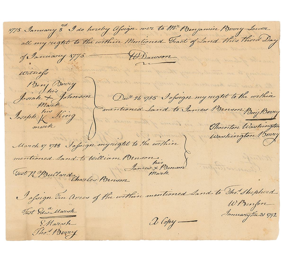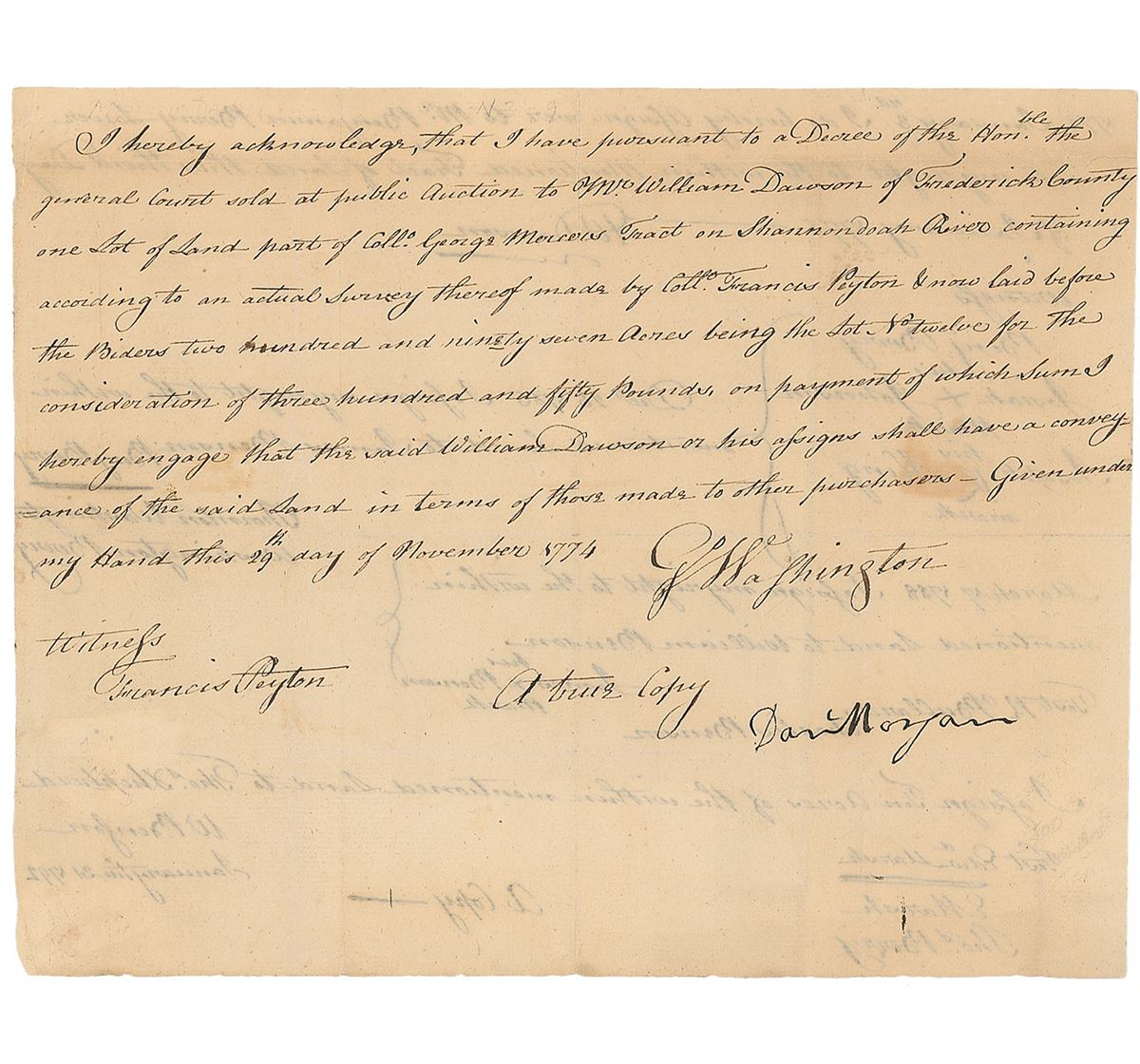 American pioneer, soldier, and congressman from Virginia considered one of the most gifted battlefield tacticians of the Revolutionary War (1736–1802). Manuscript DS, signed “Dan’l Morgan,” one page both sides, 9.25 x 7.25, November 29, 1774. A ‘true copy’ of a land transaction in which George Washington sells “one Lot of Land part of Coll. George Mercers Tract on the Shannondoah River” to Williams Dawson. Signed at the conclusion in bold ink by Morgan. The reverse bears true copies of further transactions of the land as the property is passed to successive owners, dated between 1775 and 1792. Intersecting folds with a couple small edge separations, light toning, and show-through from writing to opposing sides, otherwise fine condition.
