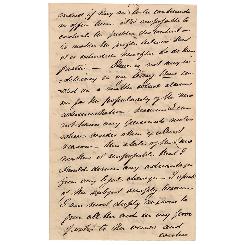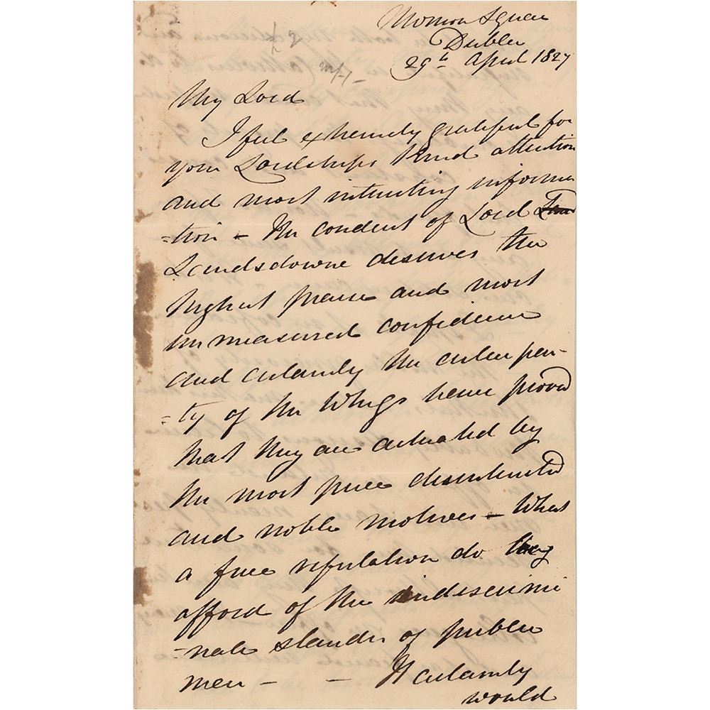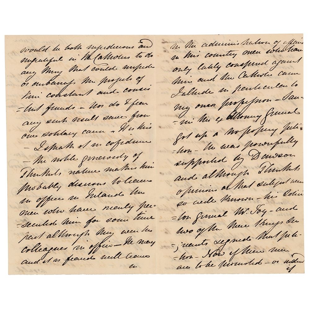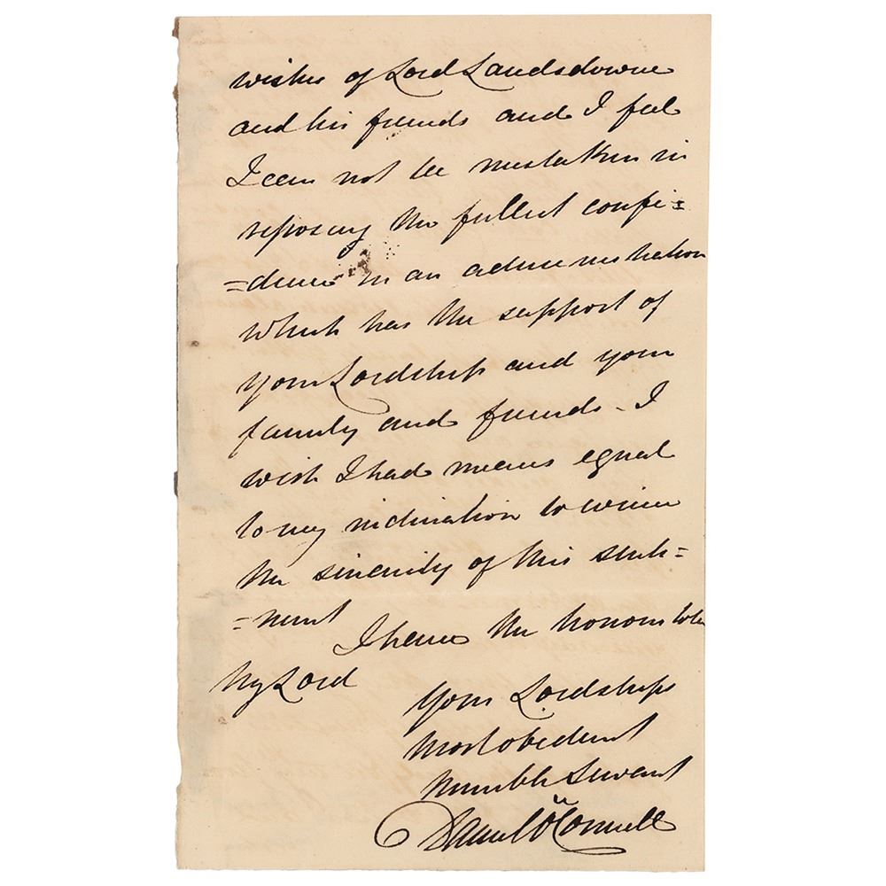 Irish political leader (1775-1847) best known for his tireless efforts on behalf of Catholic Emancipation and the repeal of the Act of Union which combined Ireland and Great Britain. ALS, five pages on three sheets, 4.75 x 7.75, April 29, 1827. Boldly penned handwritten letter to a lord, in part: "I feel extremely grateful for your Lordship's kind attention and most interesting information—the conduct of Lord Lansdowne deserves the highest praise and most unmeasured confidence…The Whigs have proved that they are actuated by the most pure disinterested and noble motives—What a fine reputation do they afford of the indiscernible slander of public men." He goes on to comment on further political matters, commenting on other politicians and the "popularity of the new administration." In fine condition, with minor mounting remnants to edges.