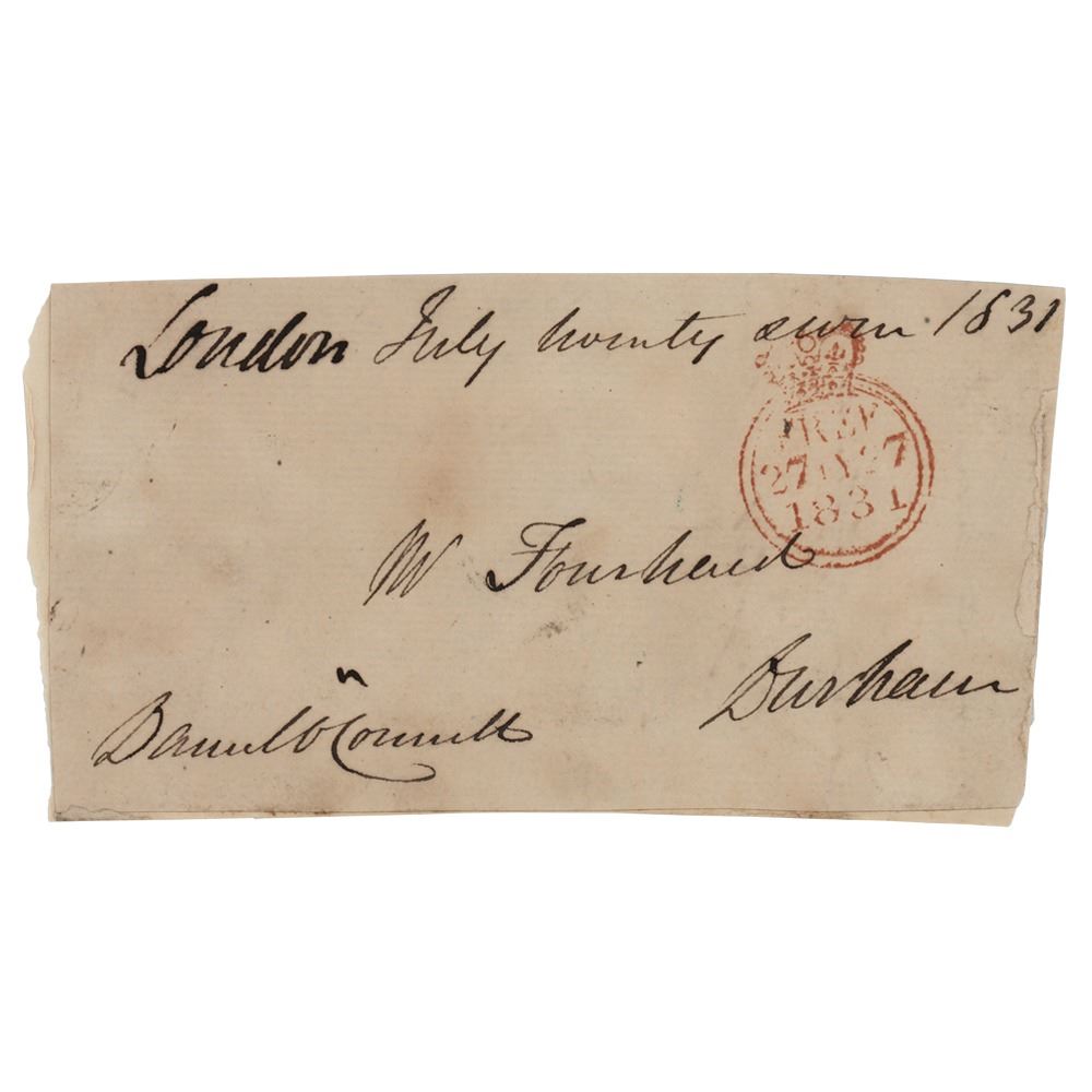 Irish political leader (1775-1847) best known for his tireless efforts on behalf of Catholic Emancipation and the repeal of the Act of Union which combined Ireland and Great Britain. Hand-addressed and free franked address panel, 5.5 x 3, addressed by O'Connell to "Mr. Fourhard, Durham," and franked in the lower left, "Daniel O'Connell." Also dated across the top by O'Connell, "London, July twenty seven, 1831," and canceled with a "Free" postmark. Affixed to a same-size sheet and in very good to fine condition, with trimmed edges and light soiling.