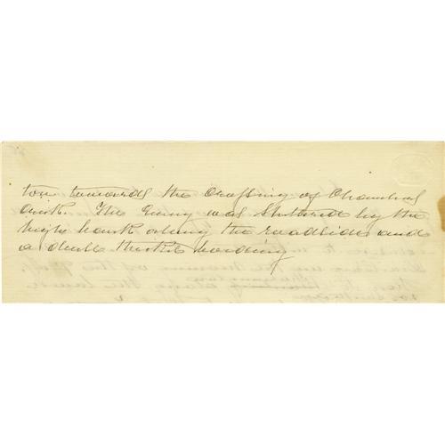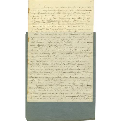 <B>Daniel Ruggles Draft Autograph Manuscript Report.</B></I> Rare Autograph Manuscript (unsigned), 1.25 pages, 7.75” x 12.25”, front and verso, n.p , n.d. , but likely written at his headquarters in Corinth, Mississippi, circa May 9-16, 1862. <BR><BR>In full: “<I>I have the honor to report, for the information of the Commanding General of the Forces that in obedience to instructions I marched my Division on the morning of the 9th of May to Farmington along the lower Southern road near which we arrived about 11 o’clock A.M. after having encountered Small Scouts of the Enemy. In the vicinity of the Town we discovered a body of his cavalry and brought a Section of Captain Ducatel's Orleans Guards Battery to bear dispersing them. My Troops took possession of the village and the Enemys Telegraph and holding the Brigades in columns in readiness to deploy. I directed a Section of Captain Hodgson's, a Section of Captain Ducatel's and a Section of Captain Hoxton's Batteries into action against masses of the Enemy apparently accompanying a line Some distance in front, awaiting in the meantime the advance of General Van Dorn's Forces on my right. The Forces on the left, General Trapier, having already arrived on my left. Under instructions from the Comdg General I then deployed into line, holding the Fourth Brigade in reserve and advanced against the Enemy and encountered his fire near the road leading to the left of Farmington towards the crossing of Chamber Creek. The Enemy was Sheltered by the high bank along the roadside and a dense thicket bordering.</B></I>"<BR><BR>This draft, probably his first, include about one-third of Ruggles’ final report to Major G. G. Garner, Assistant Adjutant General, from his Headquarters, Army of Mississippi, Corinth, Mississippi, on May 16, 1862. The final report was published in 1878 in a monthly issue of the Southern Historical Society Papers. <BR><BR>With numerous corrections and edits in his hand. The lower blank portion of the second page has been affixed to an 8.5” x 11” sheet, with light staining at blank margin, in near fine condition. <I>From the Henry E. Luhrs Collection.</B></I><BR><BR><b>Shipping:</b> Small Flat (<a target="_blank" href="http://www.heritageauctions.com/common/shipping.php">view shipping information</a>)