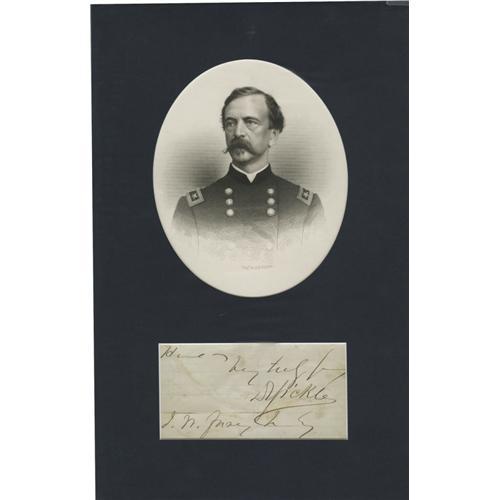 <B>Daniel Sickles</B></I> His signature, "D. Sickles," with closing on a 4.5" x 2.25" slip of paper likely removed from a letter. Clean and bright with a light vertical crease and very light soiling, but otherwise in excellent condition. Simply matted with a portrait of the Union General. <I>From the collection of Bradley O'Leary.</B></I> <I>Accompanied by COA from PSA/DNA.</B></I>