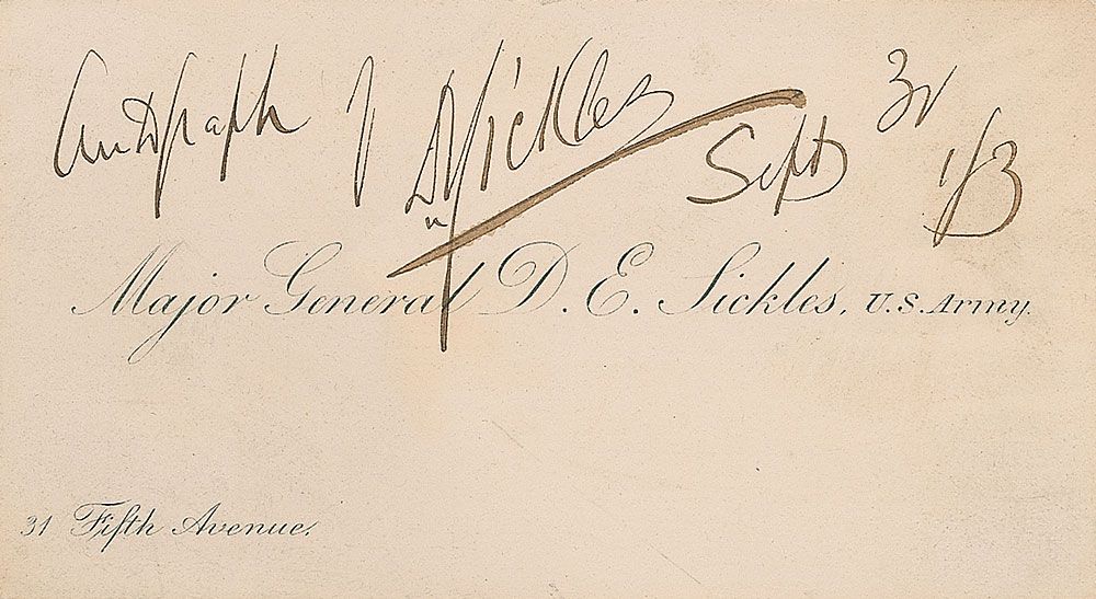 Original personal calling card bearing Sickles’s name and rank, 4 x 2.25, signed in black ink, “Autograph of D. Sickles, Sept. 30, ’83.” A few light creases, trivial soiling, and mounting remnants to reverse borders, otherwise fine condition.