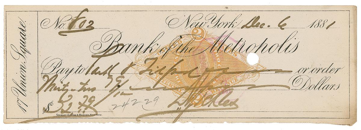 Controversial and colorful American politician and military officer (1819–1914). After discovering his young wife was having an affair, Sickles shot the man, the son of Francis Scott Key, and managed to secure an acquittal with the then-novel defense of temporary insanity. During the Civil War, Sickles served as a general and lost his leg in a famous incident at the Battle of Gettysburg. Bank check, 8.25 x 2.75, filled out and signed by Sickles, payable to Park & Tilford for $32.79, December 6, 1881. Rough bottom edge, punch hole and cancellation cut to body, neither affecting signature, some mild toning, and a small pencil notation to bottom, otherwise fine condition. RRAuction COA.