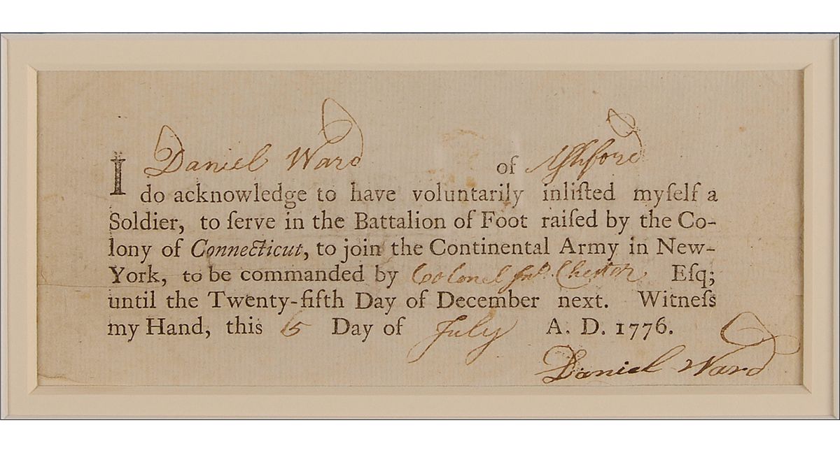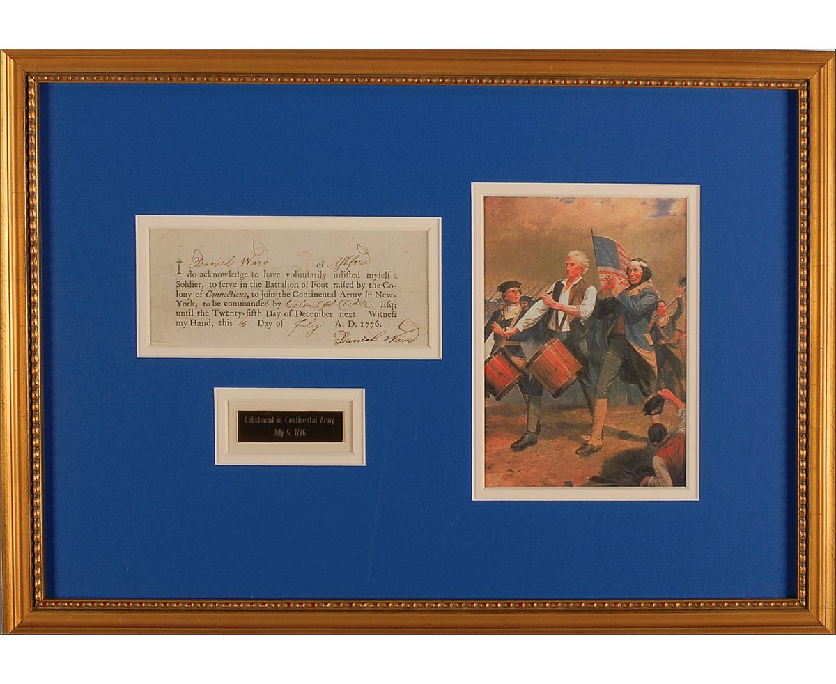 Union solider who served in the Battle of Long Island, guarding the Bedford Pass with 800 men under General John Sullivan’s command. After heavy action, the unit was routed by the British under General William Howe, and once again engaged in heavy action at the Battle of White Plains. Ward was promoted to corporal in 1781. Partly-printed DS, one page, 6.5 x 2.75, July 5, 1776. Ward signs his enlistment in the Continental Army the day after the Declaration of Independence is signed: “I, Daniel Ward, do acknowledge to have voluntarily inlisted myself a Solider, to serve in the Battalion of Foot raised by the Colony of Connecticut, to join the Continental Army in New York, to be commanded by Colonel John Chester Esq; until the Twenty-fifth Day of December next.” Double-matted and framed with an image of marching soldiers and a small commemorative plaque to an overall size of 19.75 x 13.75. In fine condition, with scattered creasing and scattered light spotting.