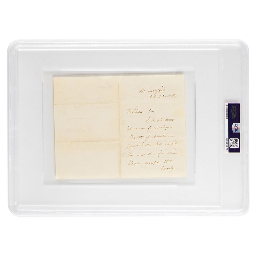 ALS signed “Dan'l Webster,†three pages on two adjoining sheets, 3.5 x 5.5, October 20, 1851. Handwritten letter to Frederick Hobbs of Bangor, Maine, in full: "I had the pleasure of receiving a Basket of delicious grapes from you, early this month, for which please accept the hearty thanks of Mrs. Webster & myself. I am happy to say that my health is very much restored. My calorist left me about the tenth of this month, & I have now only to complain of some reduction of health & strength." In fine condition. Encapsulated in a PSA/DNA authentication holder.