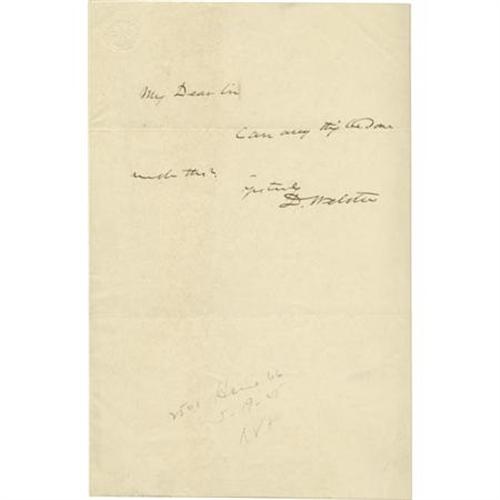 <B>Daniel Webster Autograph Note Signed</B></I> 1 page, 4.75" x 7.25", n.d., n.p. In full: "<I>My Dear Sir / Can any thing be done with this? Yrs truly D. Webster</B></I>". Usual mail folds and light toning, otherwise very good to near fine. <I>From the collection of Henry E. Luhrs</B></I><BR><BR><b>Shipping:</b> Flat Material, Small (<a target="_blank" href="http://www.heritageauctions.com/common/shipping.php">view shipping information</a>)