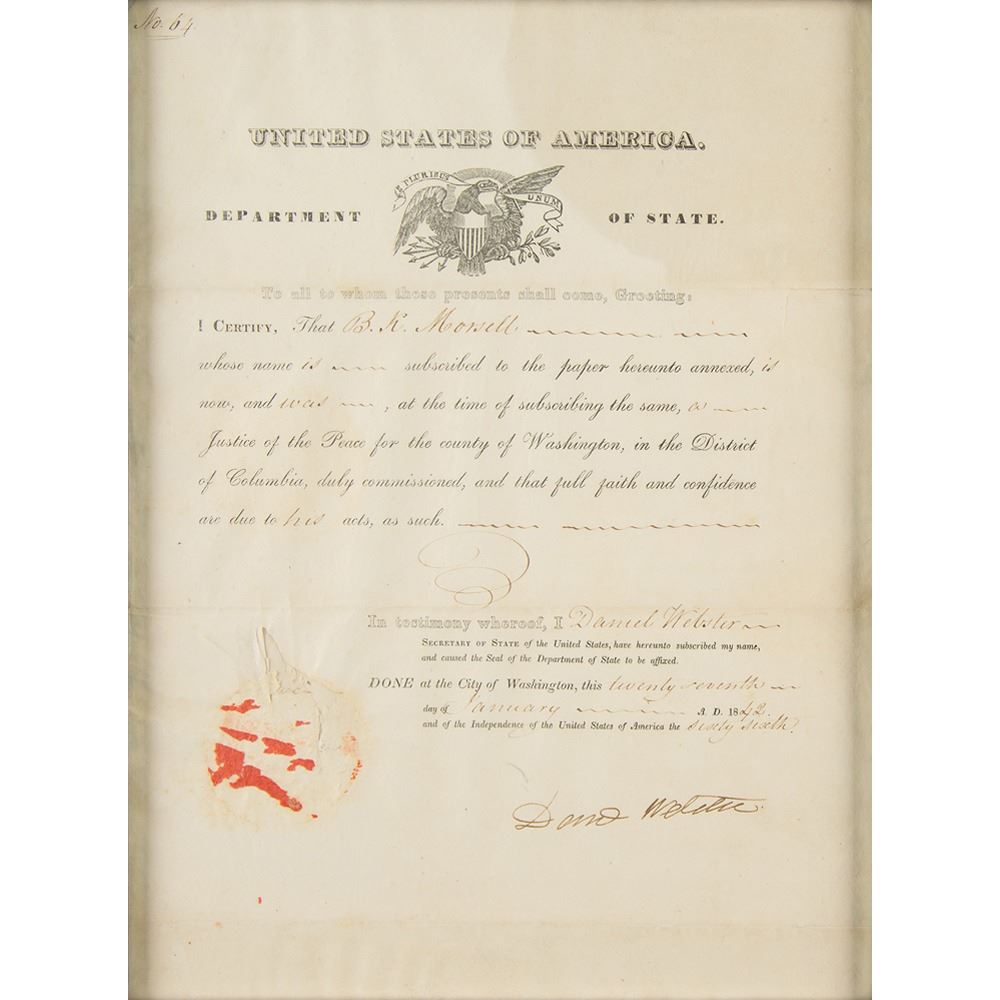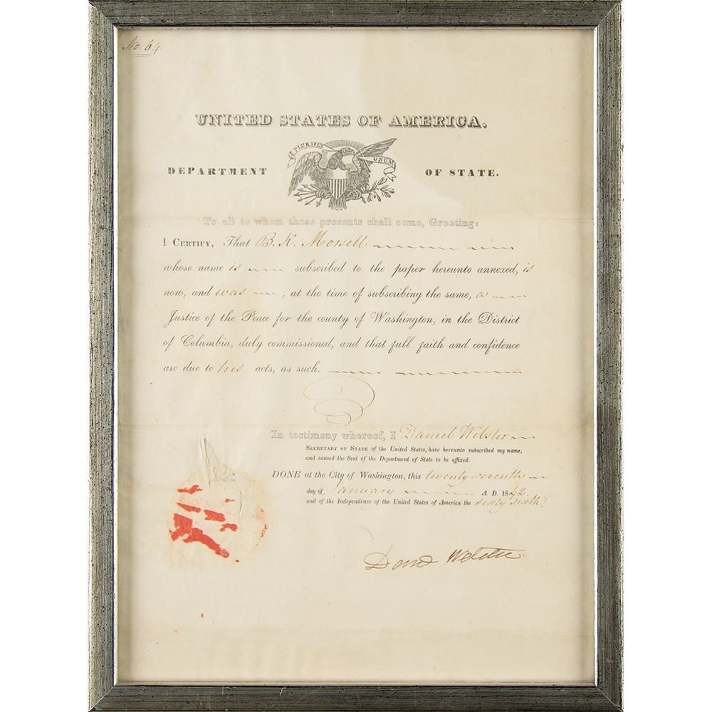 Partly-printed DS, signed “Dan'l Webster,” one page, 7.75 x 10.5, January 27, 1842. As secretary of state, Webster certifies "that B. K. Morsell…is now, and was…a Justice of the Peace for the country of Washington." Framed and in very good condition, with a missing seal, and light creasing, staining, and toning.