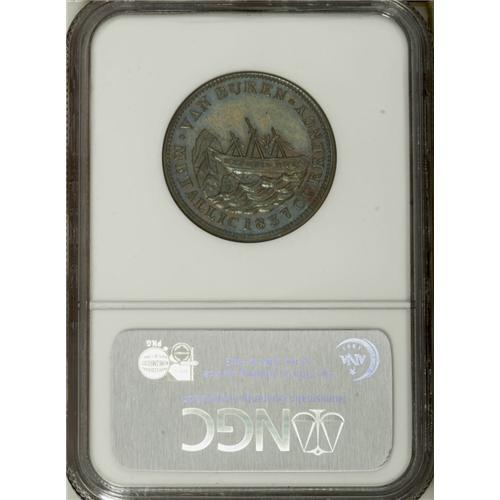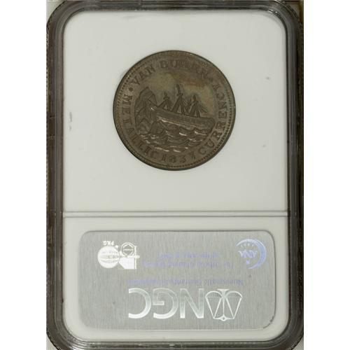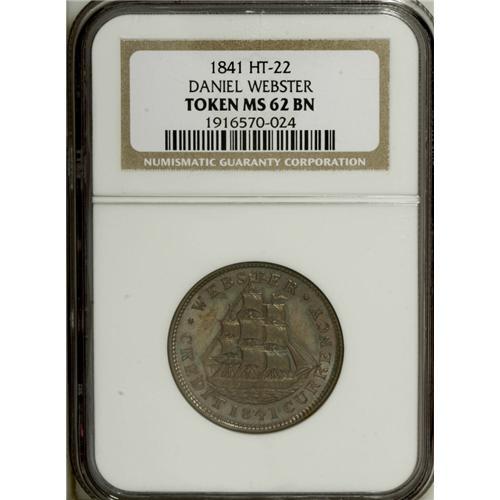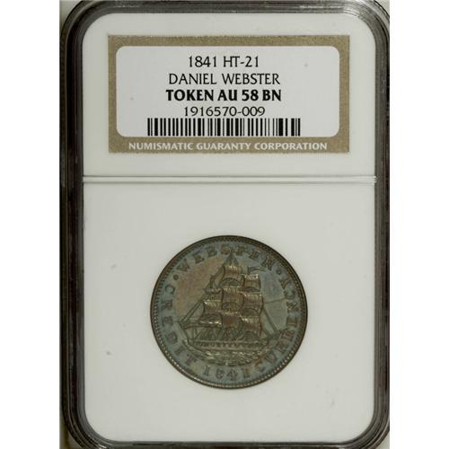 <B>Daniel Webster Hard Times Lot.</B></I> Consists of: an <B>1841 Daniel Webster AU58 NGC,</B></I> HT-21, R.2, copper, the variety with four forward stays to the foremast, lustrous with jade-green patina, a charming piece; and an <B>1841 Daniel Webster MS62 Brown NGC,</B></I> HT-22, R.1, only two forward stays to the foremast, sharp and lustrous. Current market value is about $175-$200.<BR><BR><b>Shipping:</b> Coins & Currency (<a target="_blank" href="http://www.heritageauctions.com/common/shipping.php">view shipping information</a>)