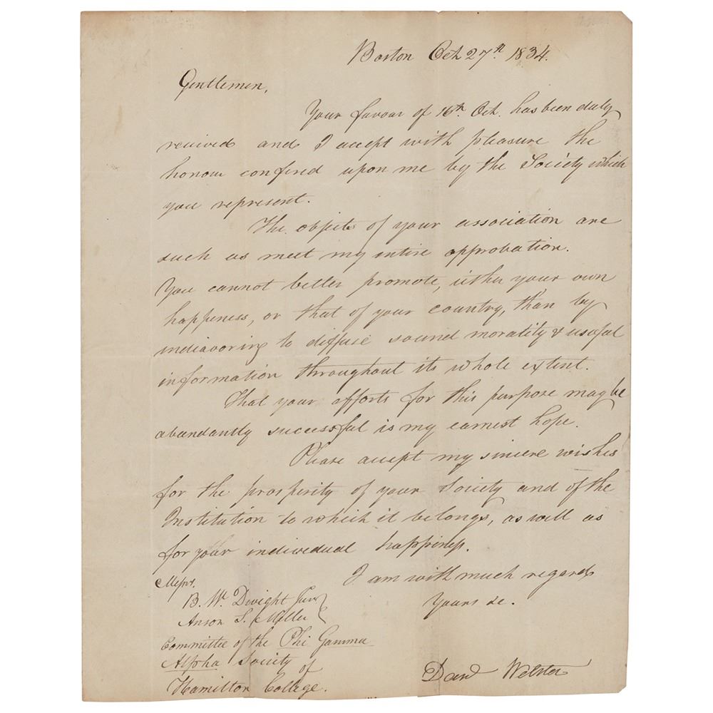 LS signed "Danl. Webster," one page, 7.75 x 9.75, October 27, 1924. Webster writes from Boston to the Phi Gamma Alpha Society of Hamilton College. In part: "I accept with pleasure the honour conferred upon me by the society which you represent. The objects of your association are such as meet my entire approbation. You cannot better promote, either your own happiness, or that of your country, than by endeavoring to diffuse sound morality & useful information throughout its whole extent. That your efforts for this purpose may be abundantly successful is my earnest hope." In very good to fine condition, with a trimmed bottom edge, and two old pieces of tape on the back of split folds.