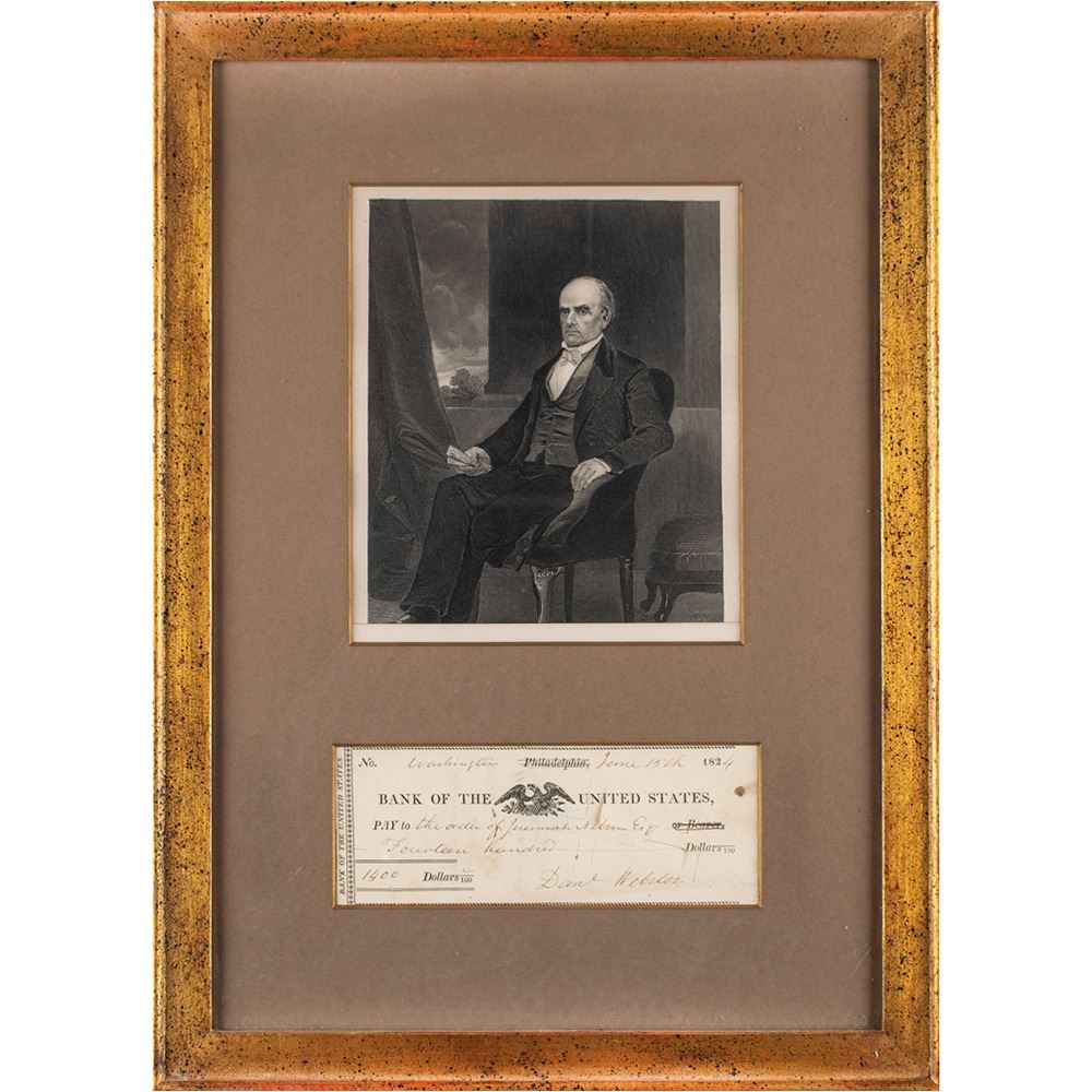 Bank of the United States check, 6 x 2.25, filled out and signed by Webster, "Dan'l Webster," payable to Jeremiah Nelson for $1400, June 15, 1824. Nicely matted and framed with an engraved portrait to an overall size of 11.5 x 16. In fine condition, with a small stain to the right edge. Provenance: Part of lot 38, Charles Hamilton, April 14, 1983.