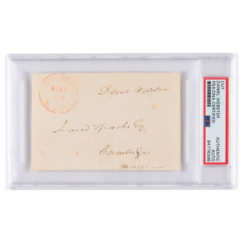 Hand-addressed and free franked mailing panel, 4.5 x 3, addressed in Webster& #39;s hand to "Jared Sparks, Esq., Cambridge, Mass.,& rdquo; and franked in the upper right, "Dan& #39;l Webster." In fine condition. Encapsulated in a PSA/DNA authentication holder.