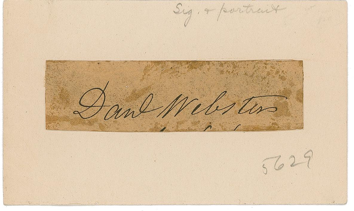 Bold ink signature “Dan’l. Webster” on an off-white 3 x 1 slip. The signature is affixed to a slightly larger card. In very good condition, with mild soiling touching portions of his signature. Accompanied by an unsigned portrait.
