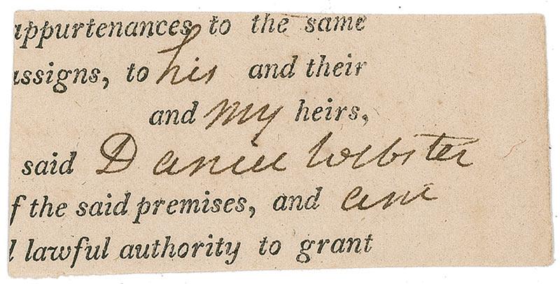 Ink signature, “Daniel Webster,” on an off-white 2.25 x 1.25 slip cut from a larger document. In fine condition. Accompanied by a 1938 New Hampshire souvenir medallion.