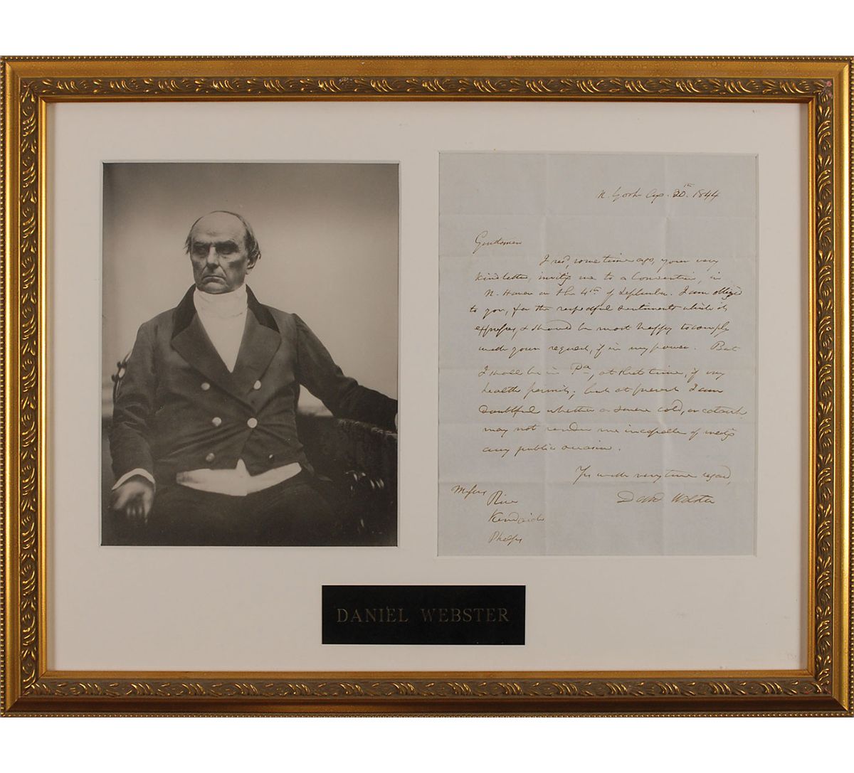 ALS signed “Danl Webster,” one page, 7.75 x 9.75, April 20, 1844. Letter to three gentlemen declining a convention invitation. In part: “I rec’d some time ago, your very kind letter inviting me to a Convention in N. Haven…But I shall be in Pa at that time, if my health permits, but at present I am doubtful whether a severe cold, or cataract may not render me incapable of making any public occasion.” Matted and framed with a portrait of Webster and a small plaque to an overall size of 21 x 16. In fine condition, with intersecting folds.